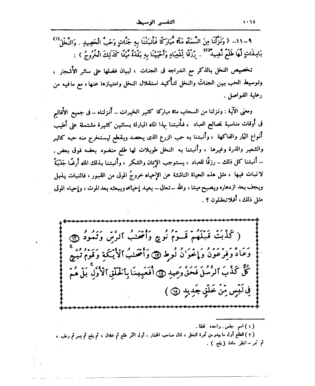 ومعنى الآية: ونزلنا من السحاب ماء مباركا كثير الخيرات - أنزلناه - في جميع الأقاليم في أوقات مناسبة لمصالح العباد، فأنبتنا بهذا الماء المبارك بساتين كثيرة مشتملة على أطيب أنواع الثمار والفاكهة، وأنبتنا به حب الزرع الذي يحصد ويقطع ليستخرج منه حبه كالبر والشعير والذرة وغيرها، وأنبتنا به النخل طويلات لها طلع منضود بعضه فوق بعض. - أنبتنا كل ذلك - رزقا للعباد، يستوجب الإيمان والشكر، وأنبتنا بذلك الماء أرضًا جدبة لا نبات فيها، مثل هذه الحياة الناشئة عن الإحياه خروجُ الموتى من القبور، فالنبات يذبل ويجف بعد ازدهاره ويصبح ميتا، والله - تعالى - يعيد أحياءه ويبعثه بعد الموت، وإحياء الموتى مثل ذلك، أفلا تعقلون؟.