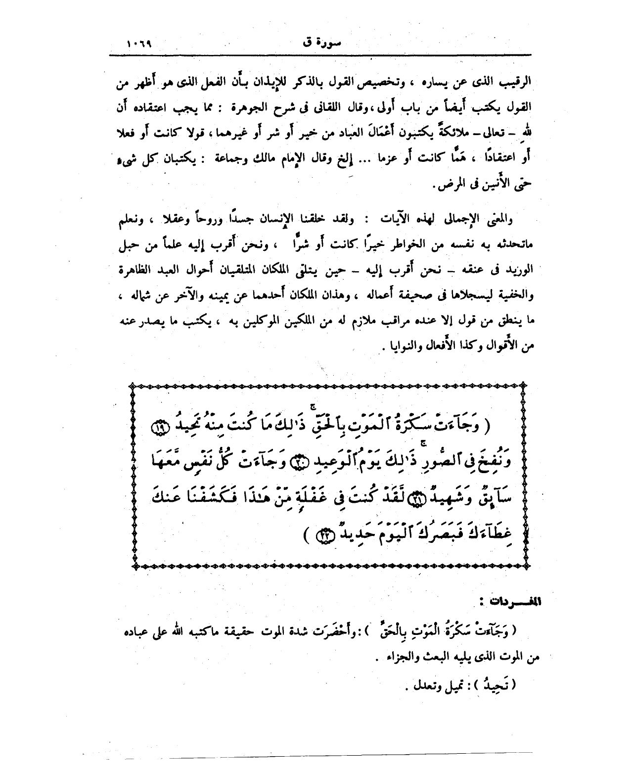 والمعنى الإجمالي لهذه الآيات: ولقد خلقنا الإنسان جسدًا وروحًا وعقلا، ونعلم ما تحدثه به نفسمه من الخواطر خيرًا كانت أو شرًّا، ونحن أقرب إليه علمًا من حبل الوريد في عنقه - نحن أقرب إليه - حين يتلقى الملكان المتلقيان أحوال العبد الظاهرة والخفية ليسجلاها في صحيفة أعماله، وهذان الملكان أحدهما عن يمينه والآخر عن شماله، ما ينطق من قول إلا عنده مراقب ملازم له من الملكين الموكلين يه، يكتب ما يصدر عنه من الأقوال وكذا الأفعال والنوايا.