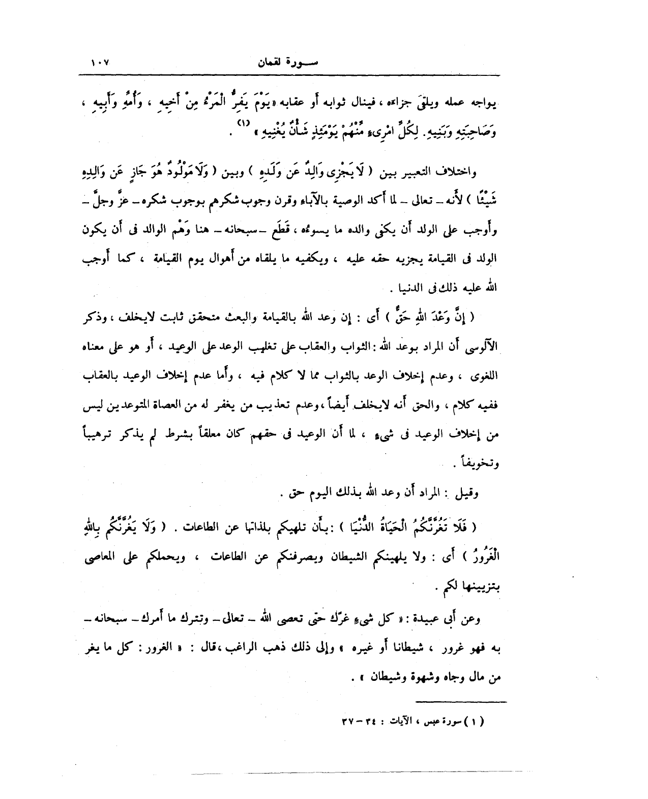 واختلاف التعبير بين {لَا يَجْزِي وَالِدٌ عَنْ وَلَدِهِ} وبين {وَلَا مَوْلُودٌ هُوَ جَازٍ عَنْ وَالِدِهِ شَيْئًا} لأنه - تعالى - لما أكد الوصية بالآباء وقرن وجوب شكرهم بوجوب شكره - عز وجل - وأوجب على الولد أن يكفى والده ما يسوءُه، قطع - سبحانه - هنا وَهْم الوالد في أن يكون الولد في القيامة يجزيه حقه عليه، ويكفيه ما يلقاه من أهوال يوم القيامة، كما أوجب الله عليه ذلك في الدنيا.