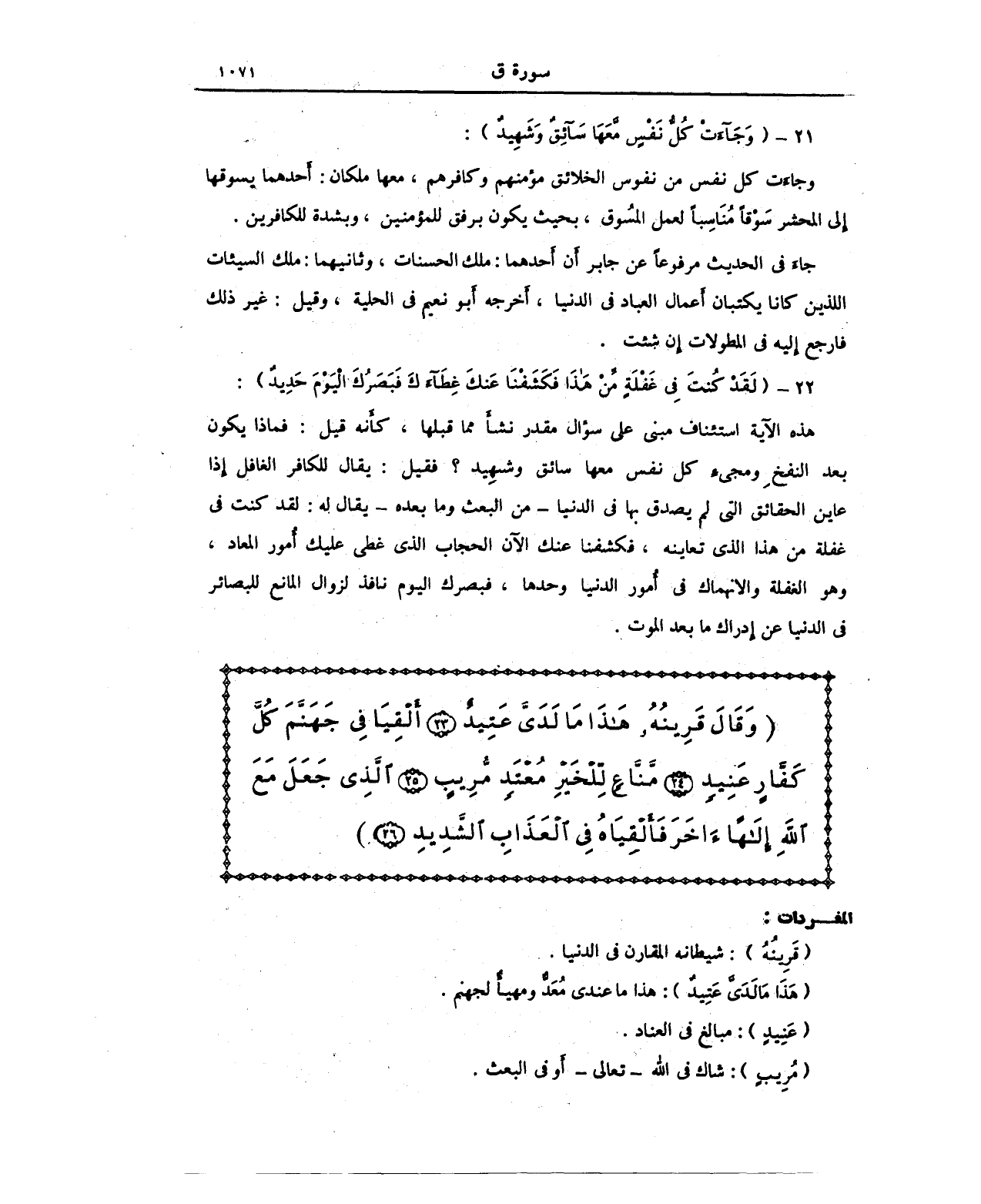 (وَقَالَ قَرِينُهُ هَذَا مَا لَدَيَّ عَتِيدٌ (23) أَلْقِيَا فِي جَهَنَّمَ كُلَّ كَفَّارٍ عَنِيدٍ (24) مَنَّاعٍ لِلْخَيْرِ مُعْتَدٍ مُرِيبٍ (25) الَّذِي جَعَلَ مَعَ اللَّهِ إِلَهًا آخَرَ فَأَلْقِيَاهُ فِي الْعَذَابِ الشَّدِيدِ)