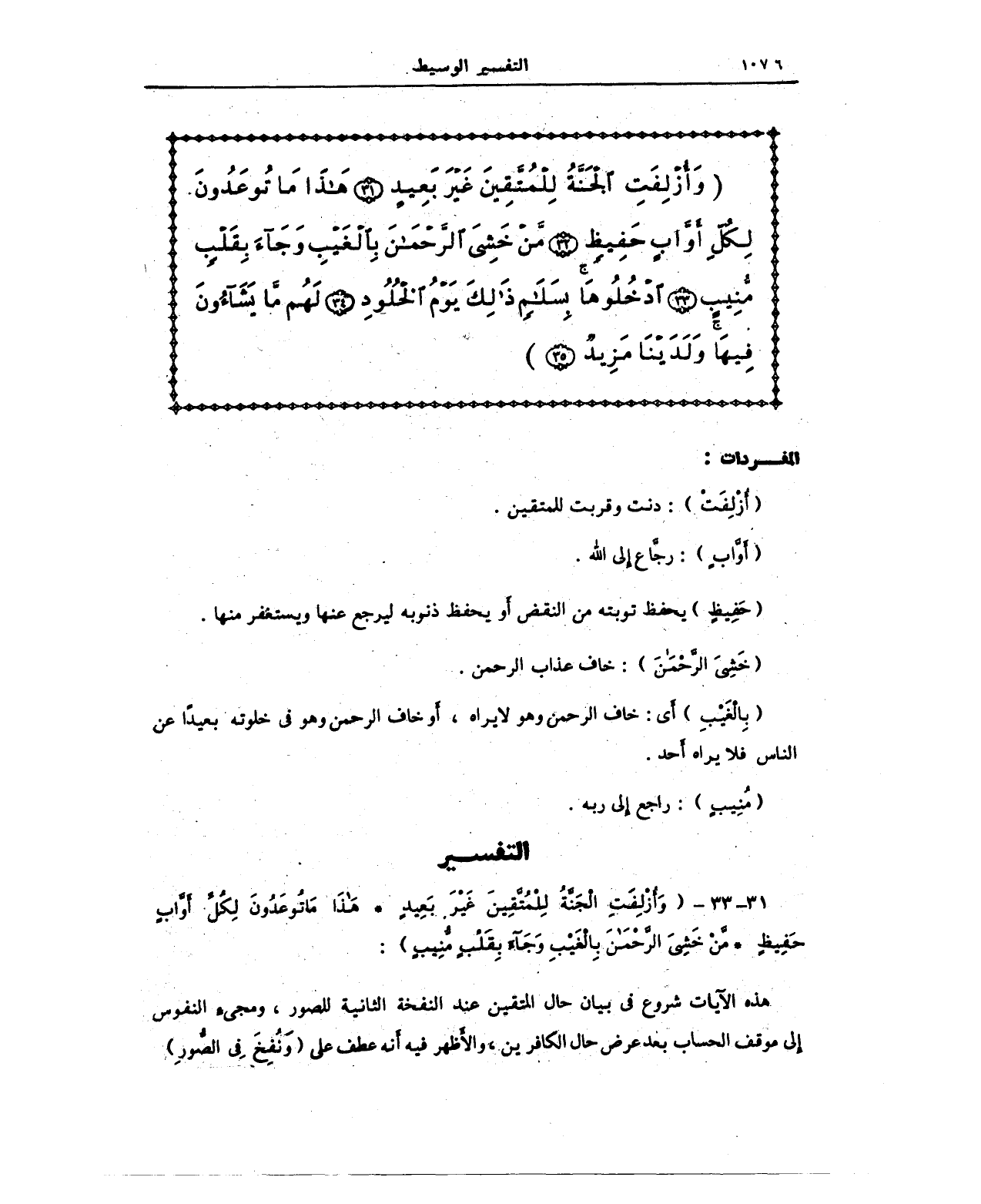 31 - 33 - (وَأُزْلِفَتِ الْجَنَّةُ لِلْمُتَّقِينَ غَيْرَ بَعِيدٍ (31) هَذَا مَا تُوعَدُونَ لِكُلِّ أَوَّابٍ حَفِيظٍ (32) مَنْ خَشِيَ الرَّحْمَنَ بِالْغَيْبِ وَجَاءَ بِقَلْبٍ مُنِيبٍ):