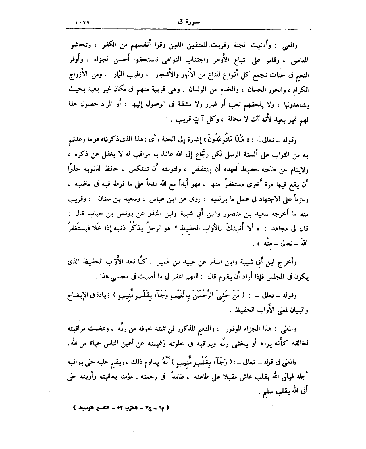 وقوله - تعالى -: (مَنْ خَشِيَ الرَّحْمَنَ بِالْغَيْبِ وَجَاءَ بِقَلْبٍ مُنِيبٍ) زيادة في الإيضاح والبيان لمعنى الأواب الحفيظ.