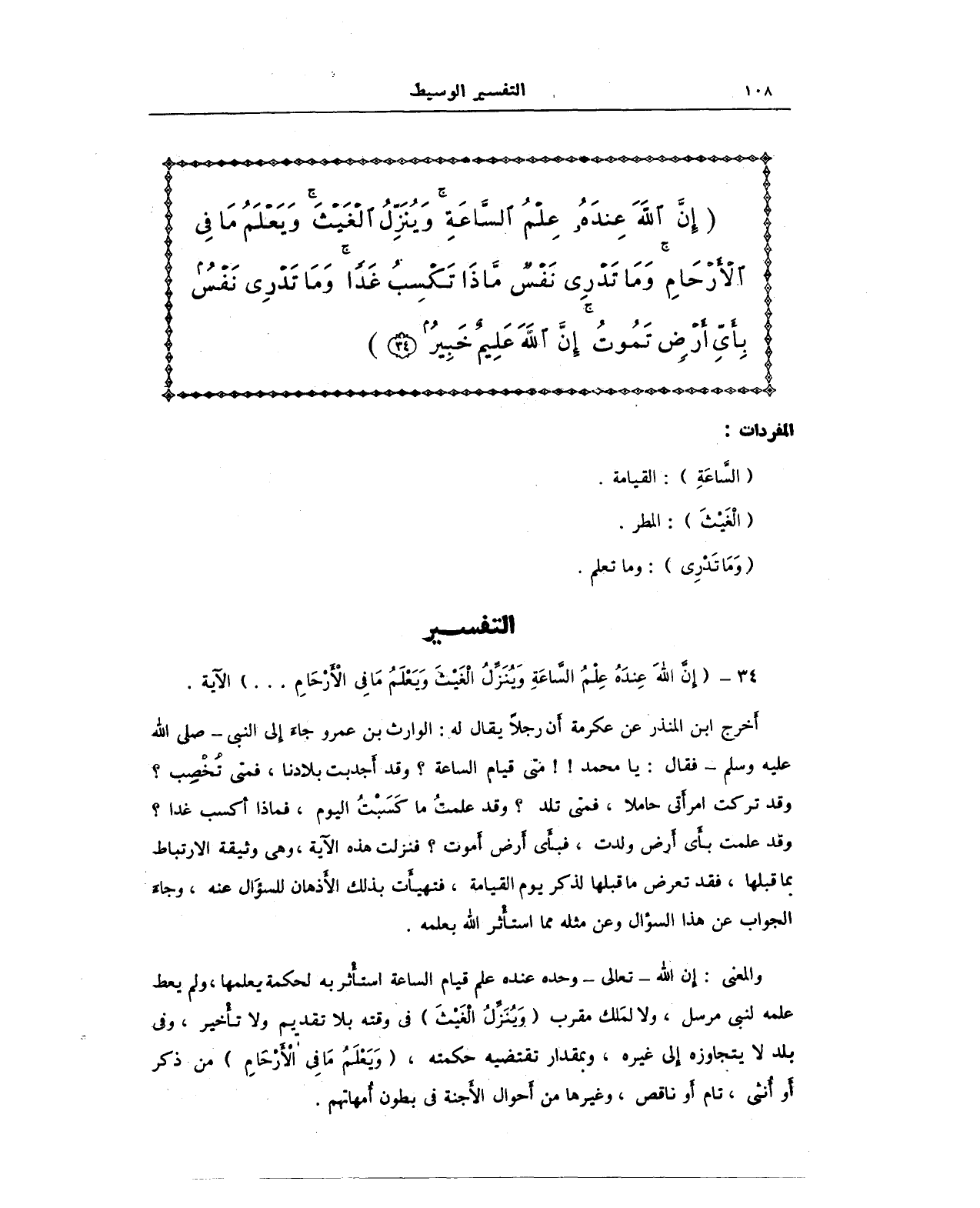 34 - {إِنَّ اللَّهَ عِنْدَهُ عِلْمُ السَّاعَةِ وَيُنَزِّلُ الْغَيْثَ وَيَعْلَمُ مَا فِي الْأَرْحَامِ ... } الآية.