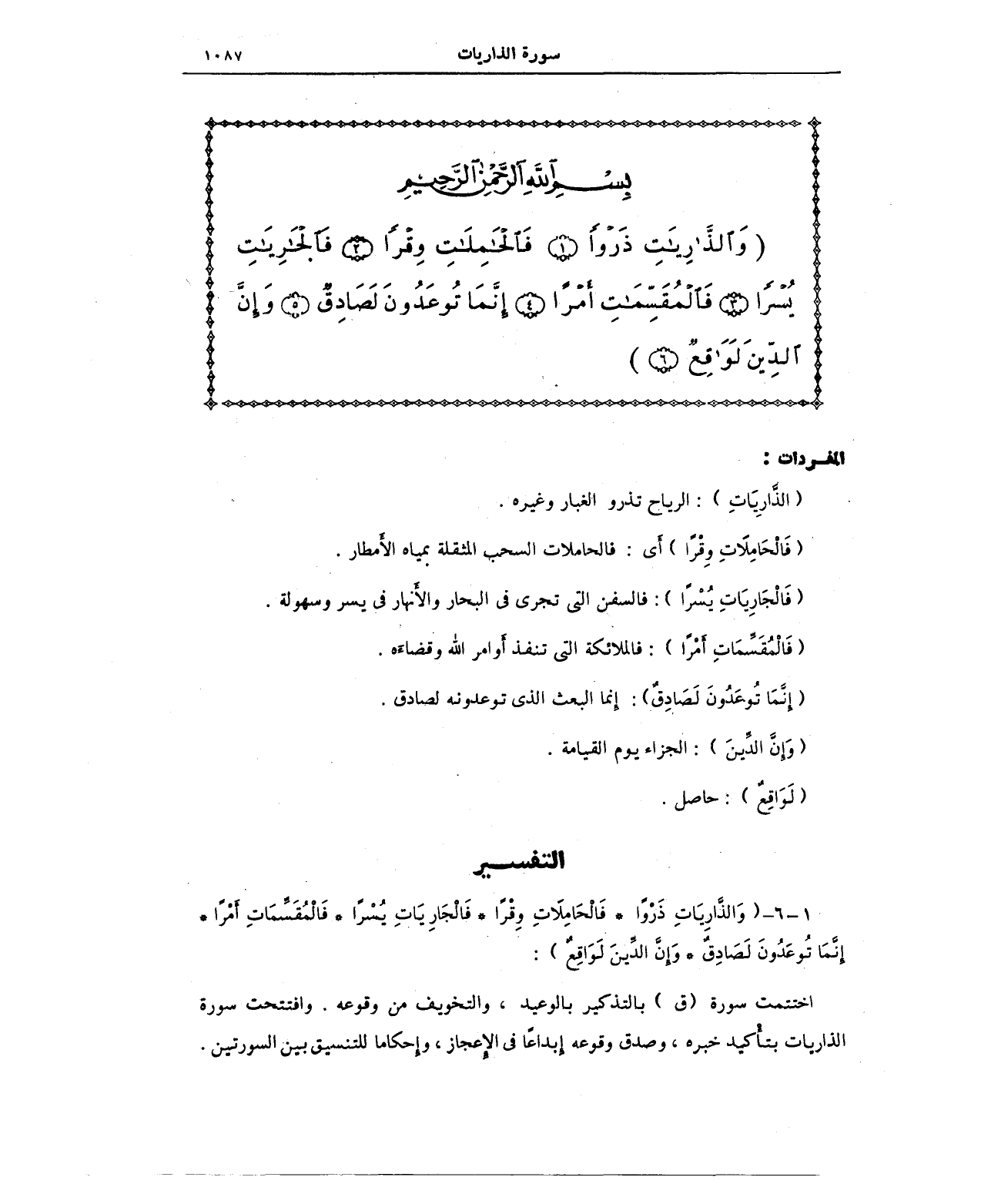 1 - 6 - (وَالذَّارِيَاتِ ذَرْوًا (1) فَالْحَامِلَاتِ وِقْرًا (2) فَالْجَارِيَاتِ يُسْرًا (3) فَالْمُقَسِّمَاتِ أَمْرًا (4) إِنَّمَا تُوعَدُونَ لَصَادِقٌ (5) وَإِنَّ الدِّينَ لَوَاقِعٌ (6)):
