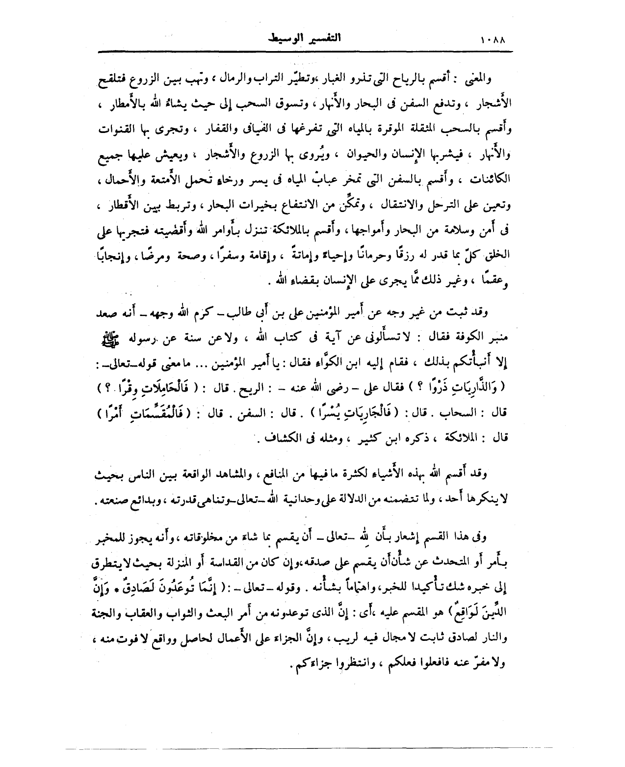 وقد ثبت من غير وجه عن أمير المؤمنين علي بن أبي طالب - كرم الله وجهه - أنه صعد منبر الكوفة فقال: لا تسألونى عن آية في كتاب الله، ولا عن سنة عن رسوله - صلى الله عليه وسلم - إلا أنبأتكم بذلك، فقام إليه ابن الكوَّاء فقال: يا أمير المؤمنين ... ما معنى قوله - تعالى -: (وَالذَّارِيَاتِ ذَرْوًا؟) فقال على - رضي الله عنه -: الريح. قال: (فَالْحَامِلَاتِ وِقْرًا؟) قال: السحاب. قال: (فَالْجَارِيَاتِ يُسْرًا). قال: السفن. قال: (فَالْمُقَسِّمَاتِ أَمْرًا) قال: الملائكة، ذكره ابن كثير، ومثله في الكشاف.