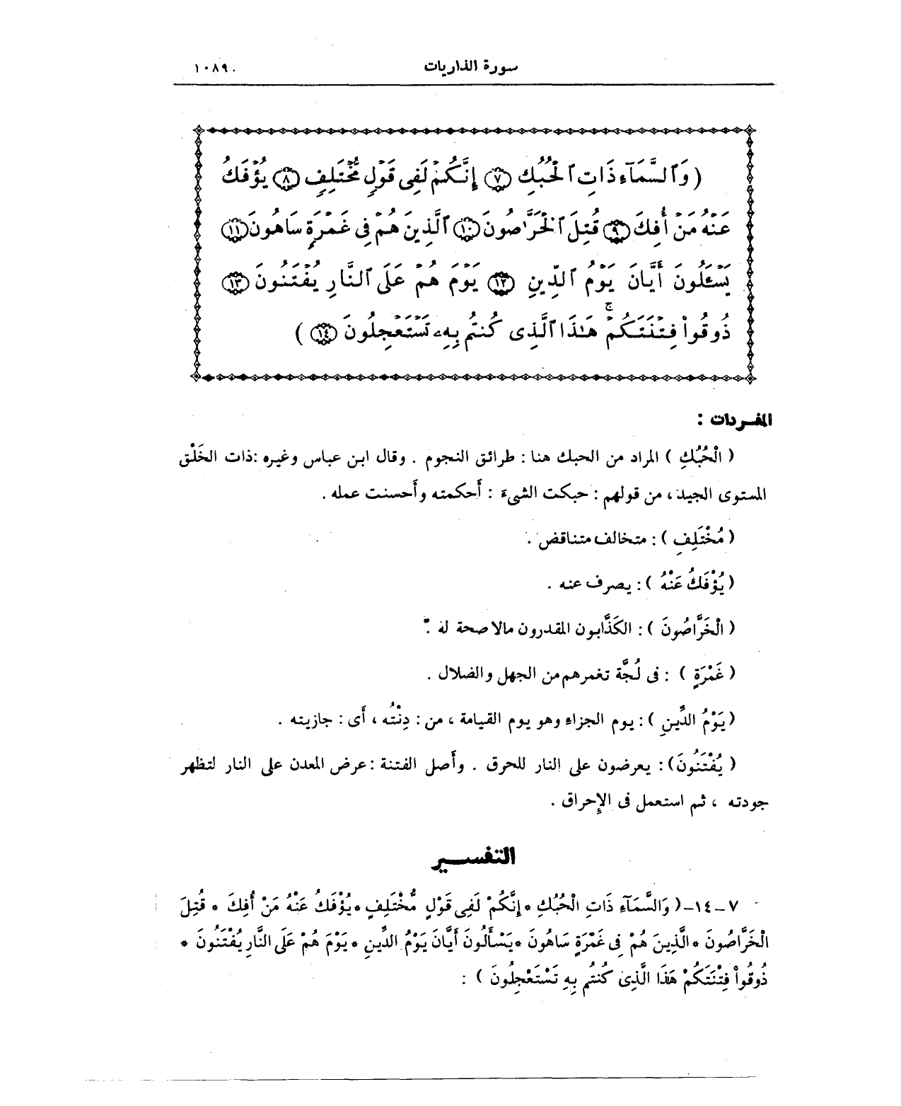(وَالسَّمَاءِ ذَاتِ الْحُبُكِ (7) إِنَّكُمْ لَفِي قَوْلٍ مُخْتَلِفٍ (8) يُؤْفَكُ عَنْهُ مَنْ أُفِكَ (9) قُتِلَ الْخَرَّاصُونَ (10) الَّذِينَ هُمْ فِي غَمْرَةٍ سَاهُونَ (11) يَسْأَلُونَ أَيَّانَ يَوْمُ الدِّينِ (12) يَوْمَ هُمْ عَلَى النَّارِ يُفْتَنُونَ (13) ذُوقُوا فِتْنَتَكُمْ هَذَا الَّذِي كُنْتُمْ بِهِ تَسْتَعْجِلُونَ (14))