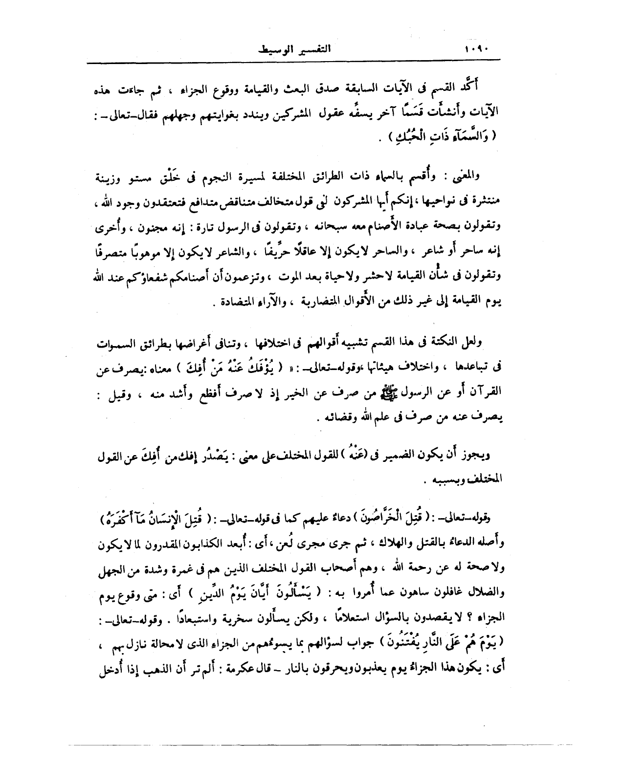 ولعل النكتة في هذا القسم تشبيه أقوالهم في اختلافها، وتنافى أغراضها بطرائق السموات في تباعدها، واختلاف هيئاتها، وقوله - تعالى -: (يُؤْفَكُ عَنْهُ مَنْ أُفِكَ) معناه: يصرف عن القرآن أو عن الرسول - صلى الله عليه وسلم - من صرف عن الخير إذ لا صرف أفظع وأشد منه، وقيل: يصرف عنه من صرف في علم الله وقضائه.