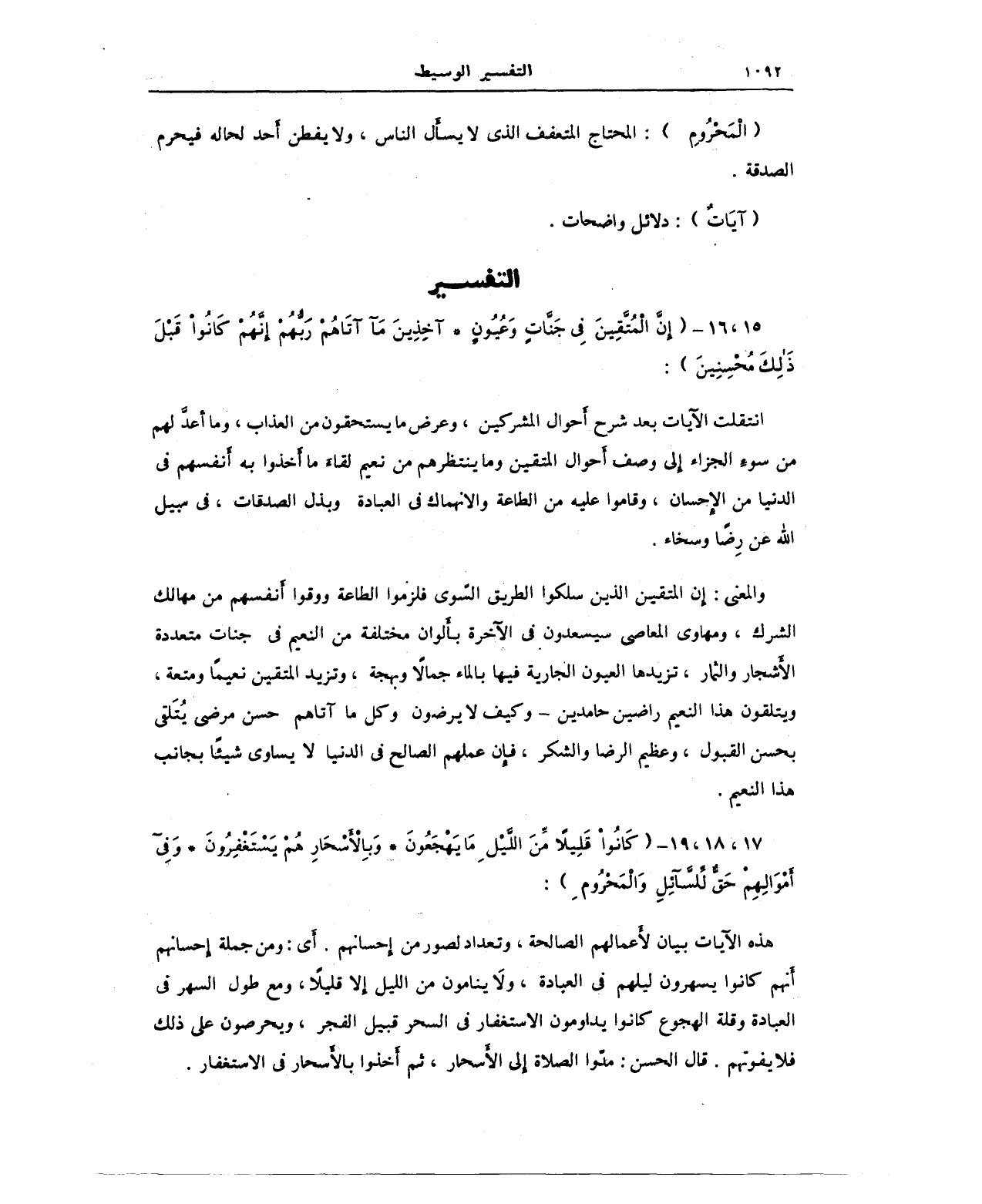 هذه الآيات بيان لأعمالهم الصالحة، وتعداد لصور من إحسانهم. أي: ومن جملة إحسانهم أنهم كانوا يسهرون ليلهم في العبادة، ولا ينامون من الليل إلا قليلًا، ومع طول السهر في العبادة وقلة الهجوع كانوا يداومون الاستغفار في السحر قبيل الفجر، ويحرصون على ذلك فلا يفوتهم. قال الحسن: مدّوا الصلاة إلى الأسحار، ثم أخذوا بالأسحار في الاستغفار.