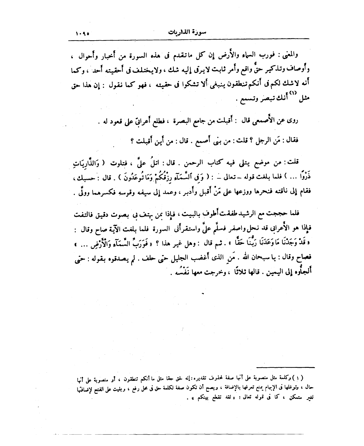 فلما حججت مع الرشيد طفقت أطوف بالبيت، فإذا بمن يهتف بى بصوت دقيق فالتفت فإذا هو الأعرابى قد نحل واصفر فسلَّم عليَّ واستقرأنى السورة فلما بلغت الآية صاح وقال: {قَدْ وَجَدْنَا مَا وَعَدَنَا رَبُّنَا حَقًّا}. ثم قال: وهل غير هذا؟ {فوربِّ السماء الأرض ... } فصاح وقال: يا سبحان الله. من الذي أغضب الجليل حتى حلف. لم يصدقوه بقوله: حتى ألجأوه إلى اليمين. قالها ثلاثًا، وخرجت معها نَفْسه.