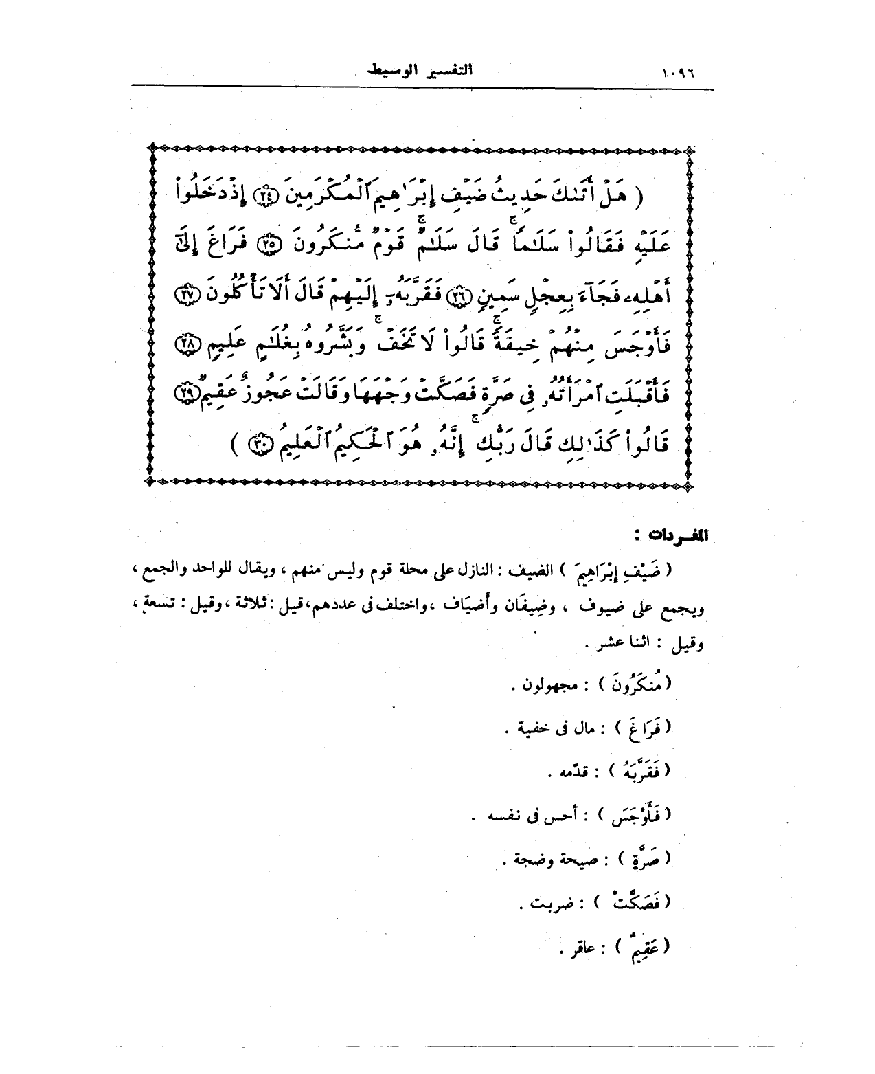 (هَلْ أَتَاكَ حَدِيثُ ضَيْفِ إِبْرَاهِيمَ الْمُكْرَمِينَ (24) إِذْ دَخَلُوا عَلَيْهِ فَقَالُوا سَلَامًا قَالَ سَلَامٌ قَوْمٌ مُنْكَرُونَ (25) فَرَاغَ إِلَى أَهْلِهِ فَجَاءَ بِعِجْلٍ سَمِينٍ (26) فَقَرَّبَهُ إِلَيْهِمْ قَالَ أَلَا تَأْكُلُونَ (27) فَأَوْجَسَ مِنْهُمْ خِيفَةً قَالُوا لَا تَخَفْ وَبَشَّرُوهُ بِغُلَامٍ عَلِيمٍ (28) فَأَقْبَلَتِ امْرَأَتُهُ فِي صَرَّةٍ فَصَكَّتْ وَجْهَهَا وَقَالَتْ عَجُوزٌ عَقِيمٌ (29) قَالُوا كَذَلِكِ قَالَ رَبُّكِ إِنَّهُ هُوَ الْحَكِيمُ الْعَلِيمُ)