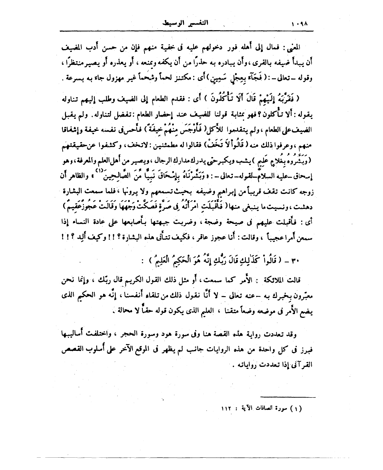 (فَقَرَّبَهُ إِلَيْهِمْ قَالَ أَلَا تَأْكُلُونَ) أي: فقدم الطعام إلى الضيف وطلب إليهم تناوله يقوله: ألا تأكلون؟ فهو بمثابة قولنا للضيف عند إحضار الطعام: تفضل لتناوله. ولم يقبل الضيف على الطعام، ولم يتقدموا للأكل (فَأَوْجَسَ مِنْهُمْ خِيفَةً) فأحس في نفسه خيفة وإشفاقا منهم، وعرفوا في ذلك منه (قالوا لا تخف) فقالوا له مطمئنين: لا تخف، وكشفوا عن حقيقتهم (وبشروه بغلام عليم) يشب ويكبر حتى يدرك مدارك الرجال، ويصير من أهل العلم والمعرفة، وهو إسحاق - عليه السلام - لقوله تعالى -: {وَبَشَّرْنَاهُ بِإِسْحَاقَ نَبِيًّا مِنَ الصَّالِحِينَ (¬1)} والظاهر أَن زوجه كانت تقف قريبًا من إبراهيم وضيفه بحيث تسمعهم ولا يرونها، فلما سمعت البشارة دهشت، ونسيت ما ينبغي منها (فَأَقْبَلَتِ امْرَأَتُهُ فِي صَرَّةٍ فَصَكَّتْ وَجْهَهَا وَقَالَتْ عَجُوزٌ عَقِيمٌ) أي: فأقبلت عليهم في صيحة وضجة، وضربت جبهتها بأصابعها على عادة النساء إذا سمعن أمرا عجيبًا، وقالت: أنا عجوز عاقر، فكيف تتأتى هذه البشارة؟!! وكيف ألِد؟!!