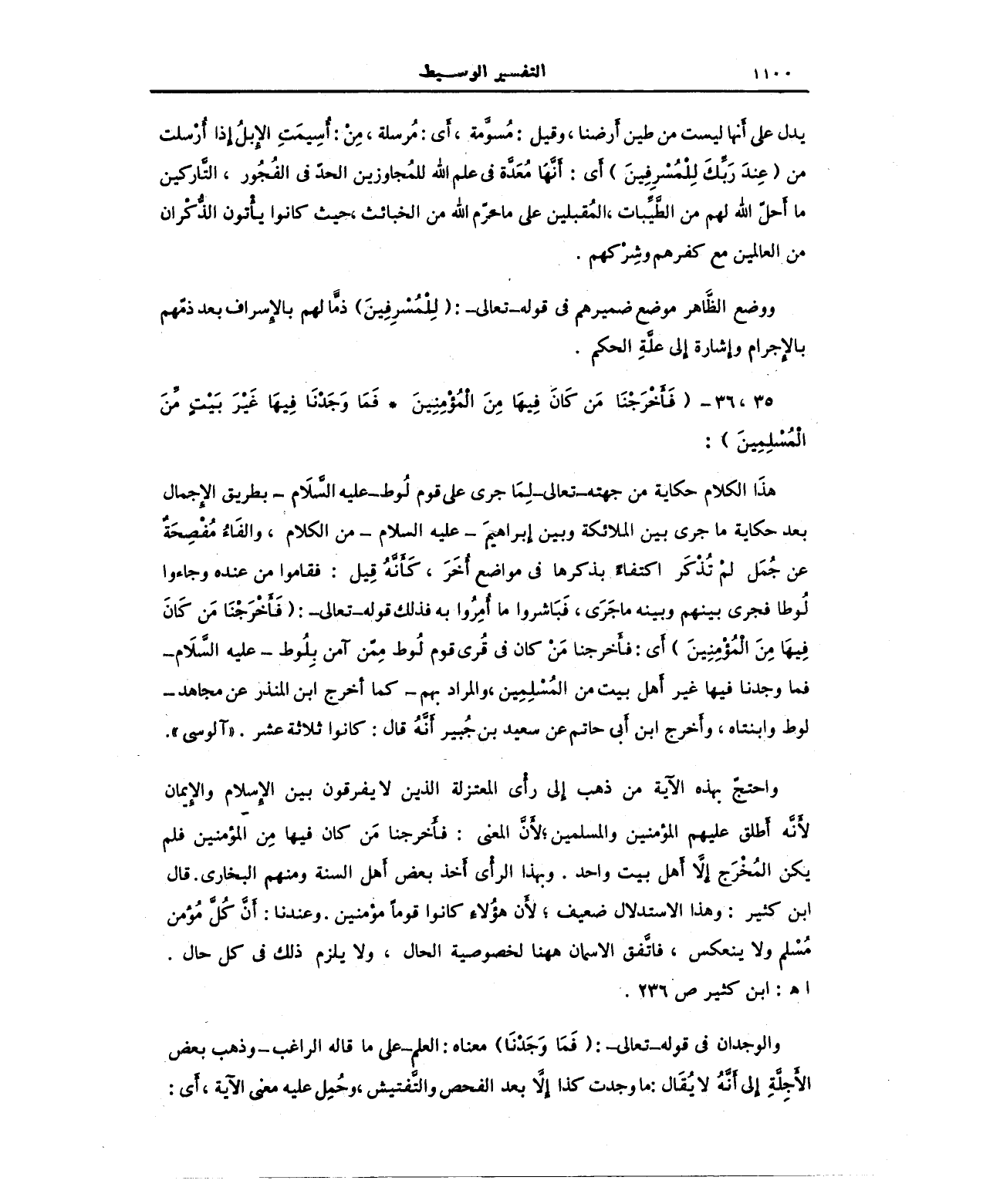 واحتجّ بهذه الآية من ذهب إلى رأى المعتزلة الذين لا يفرقون بين الإِسلام والإيمان لأنه أطلق عليهم المؤمنين والمسلمين؛ لأن المعنى: فأخرجنا من كان فيها من المؤمنين فلم يكن المُخرَج إلاَّ أهل بيت واحد. وبهذا الرأى أخذ بعض أهل السنة ومنهم البخاري. قال ابن كثير: وهذا الاستدلال ضعيف؛ لأن هؤلاء كانوا قومًا مؤمنين. وعندنا: أَنَّ كل مؤمن مسلم ولا ينعكس، فاتَّفق الاسمان هاهنا لخصوصية الحال، ولا يلزم ذلك في كل حال. اهـ: ابن كثير ص 236.