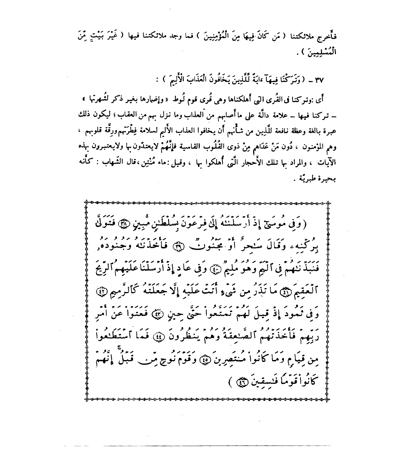 (وَفِي مُوسَى إِذْ أَرْسَلْنَاهُ إِلَى فِرْعَوْنَ بِسُلْطَانٍ مُبِينٍ (38) فَتَوَلَّى بِرُكْنِهِ وَقَالَ سَاحِرٌ أَوْ مَجْنُونٌ (39) فَأَخَذْنَاهُ وَجُنُودَهُ فَنَبَذْنَاهُمْ فِي الْيَمِّ وَهُوَ مُلِيمٌ (40) وَفِي عَادٍ إِذْ أَرْسَلْنَا عَلَيْهِمُ الرِّيحَ الْعَقِيمَ (41) مَا تَذَرُ مِنْ شَيْءٍ أَتَتْ عَلَيْهِ إِلَّا جَعَلَتْهُ كَالرَّمِيمِ (42) وَفِي ثَمُودَ إِذْ قِيلَ لَهُمْ تَمَتَّعُوا حَتَّى حِينٍ (43) فَعَتَوْا عَنْ أَمْرِ رَبِّهِمْ فَأَخَذَتْهُمُ الصَّاعِقَةُ وَهُمْ يَنْظُرُونَ (44) فَمَا اسْتَطَاعُوا مِنْ قِيَامٍ وَمَا كَانُوا مُنْتَصِرِينَ (45) وَقَوْمَ نُوحٍ مِنْ قَبْلُ إِنَّهُمْ كَانُوا قَوْمًا فَاسِقِينَ (46))