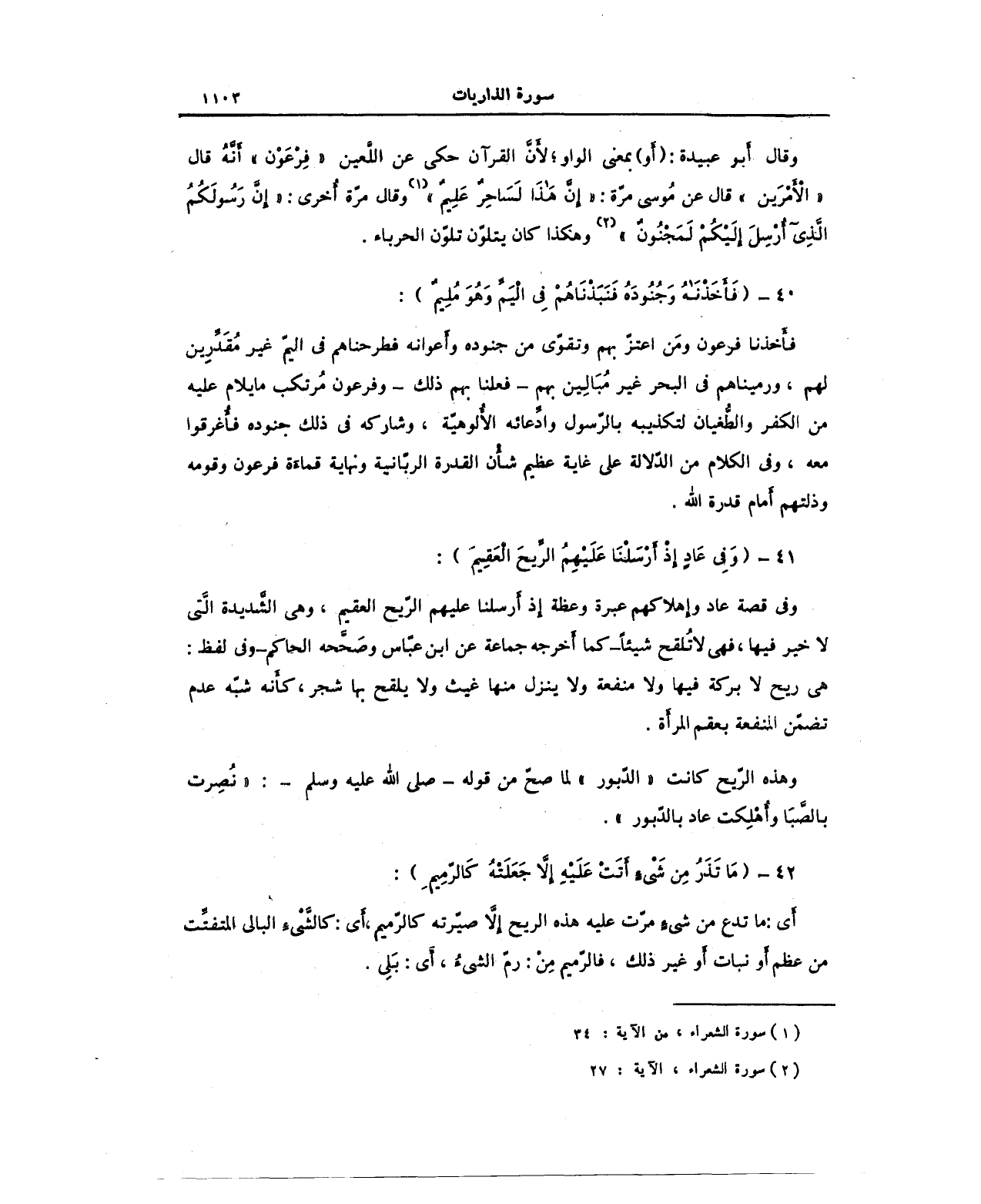 وفي قصة عاد وإهلاكهم عبرة وعظة إذ أرسلنا عليهم الريح العقيم، وهي الشديدة التي لا خير فيها، فهي لا تُلقح شيئًا - كما أخرجه جماعة عن ابن عباس وصححه الحاكم - وفي لفظ: هي ريح لا بركة فيها ولا منفعة ولا ينزل منها غيث ولا يلقح بها شجر، كأنه شبّه عدم تضمن المنفعة بعقم المرأة.