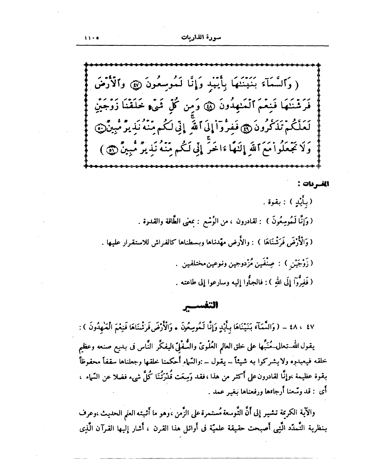 (وَالسَّمَاءَ بَنَيْنَاهَا بِأَيْدٍ وَإِنَّا لَمُوسِعُونَ (47) وَالْأَرْضَ فَرَشْنَاهَا فَنِعْمَ الْمَاهِدُونَ (48) وَمِنْ كُلِّ شَيْءٍ خَلَقْنَا زَوْجَيْنِ لَعَلَّكُمْ تَذَكَّرُونَ (49) فَفِرُّوا إِلَى اللَّهِ إِنِّي لَكُمْ مِنْهُ نَذِيرٌ مُبِينٌ (50) وَلَا تَجْعَلُوا مَعَ اللَّهِ إِلَهًا آخَرَ إِنِّي لَكُمْ مِنْهُ نَذِيرٌ مُبِينٌ (51))