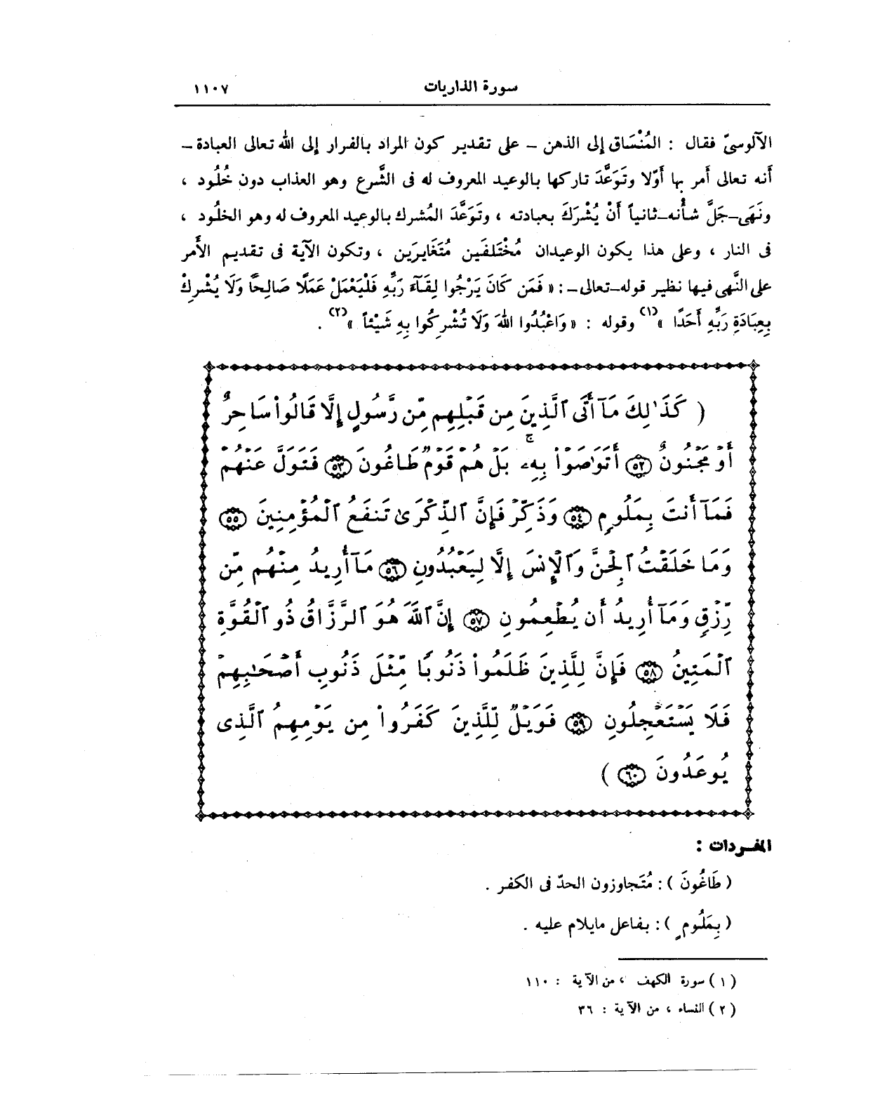 الآلوسي فقال: المنساق إلى الذهن - على تقدير كون المراد بالفرار إلى الله تعالى العبادة - أنه تعالى أمر بها أوّلا وتوعَّد تاركها بالوعيد المعروف له في الشَّرع وهو العذاب دون خلود، ونهى - جل شأنه - ثانيًا أَن يشرك بعبادته، وتوعَّد المُشرك بالوعيد المعروف له وهو الخلود، في النار، وعلى هذا يكون الوعيدان مختلفين متغايرين، وتكون الآية في تقديم الأمر على النهي فيها نظير قول - تعالى - (فَمَنْ كَانَ يَرْجُو لِقَاءَ رَبِّهِ فَلْيَعْمَلْ عَمَلًا صَالِحًا وَلَا يُشْرِكْ بِعِبَادَةِ رَبِّهِ أَحَدًا) (¬1) وقوله: (وَاعْبُدُوا اللَّهَ وَلَا تُشْرِكُوا شَيْئًا) (¬2).