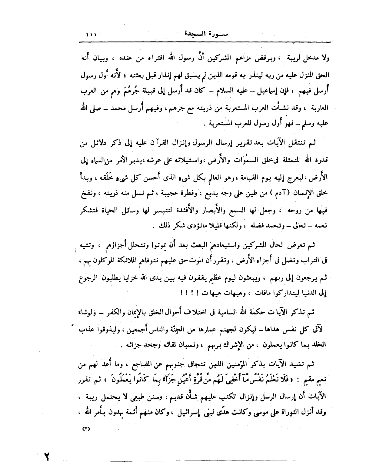 ولا مدخل لريبة، وبرفض مزاعم المشركين أن رسول الله افتراه من عنده، وبيان أنه الحق المنزل علية من ربه لينذر به قومه الذين لم يسبق لهم إنذار قبل بعثته، لأنه أول رسول أُرسل فيهم، فإن إسماعيل - عليه السلام - كان قد أرسل إلى قبيلة جُرهُمَ وهم من العرب العاربة، وقد نشأت العرب المستعربة من ذريته مع جرهم، وفيهم أُرسل محمد - صلى الله عليه وسلم - فهو أول رسول للعرب المستعربة.