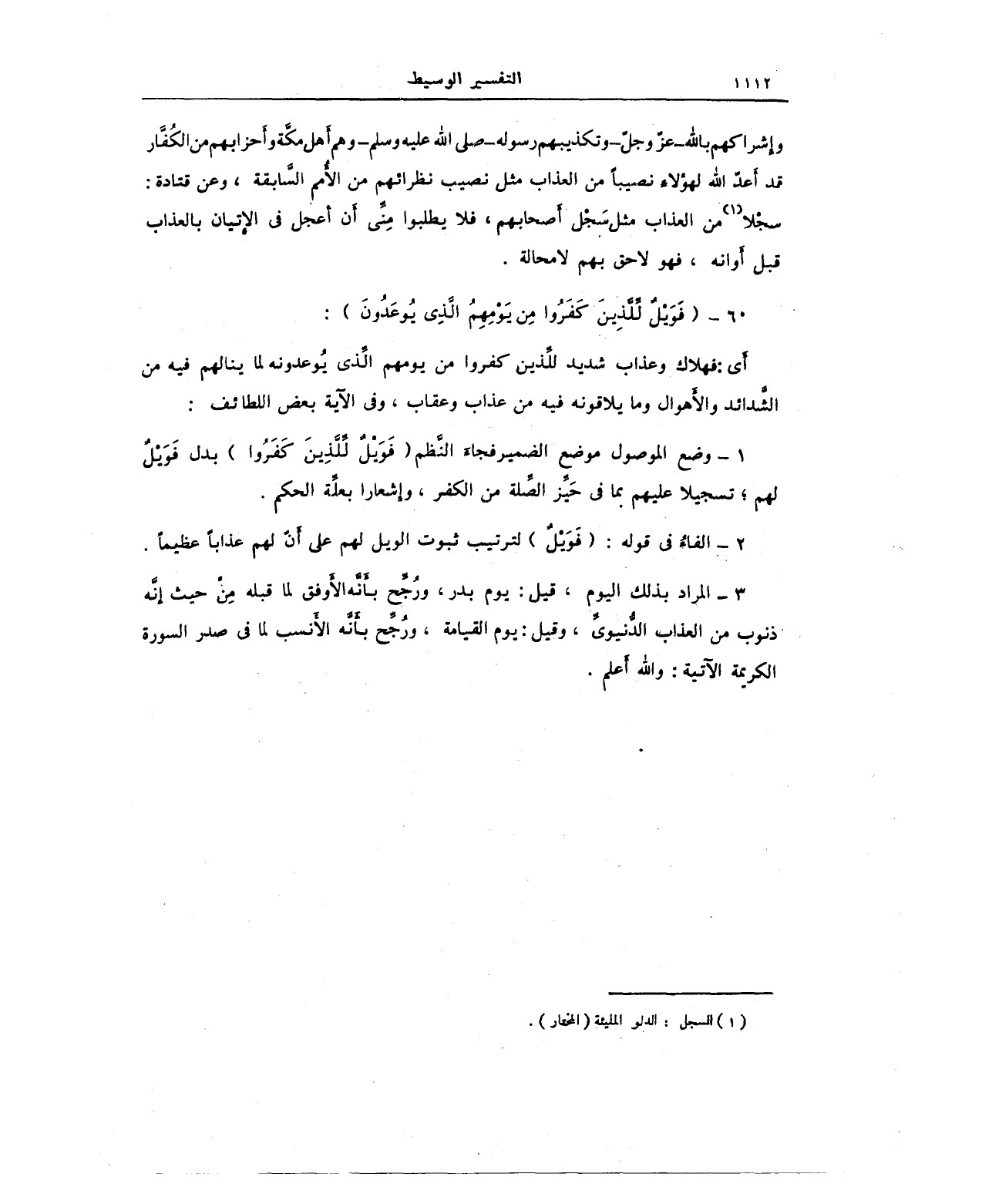 3 - المراد بذلك اليوم، قيل: يوم بدر، ورُجِّح بأنه الأوفق لما قبله من حيث إنه ذنوب من العذاب الدنيوى، وقيل: يوم القيامة، ورجح بأنه الأنسب لما في صدر السورة الكريمة الآتية: والله أعلم.