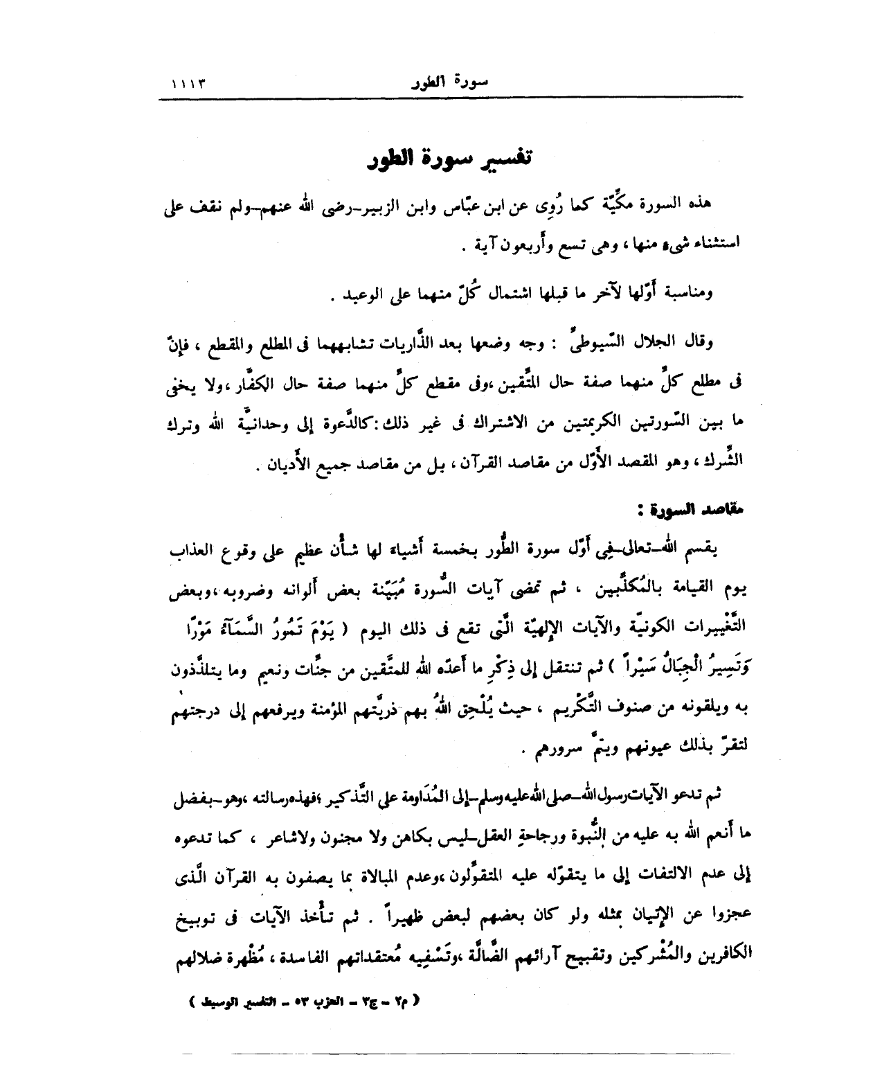 وقال الجلال السيوطى: وجه وضعها بعد الذاريات تشابههما في المطلع والمقطع، فإن في مطلع كل منهما صفة حال المتقين، وفي مقطع كل منهما صفة حال الكفار، ولا يخفى ما بين السورتين الكريمتين من الاشتراك في غير ذلك: كالدعوة إلى وحدانية الله وترك الشرك، وهو المقصد الأول من مقاصد القرآن، بل من مقاصد جميع الأديان.
