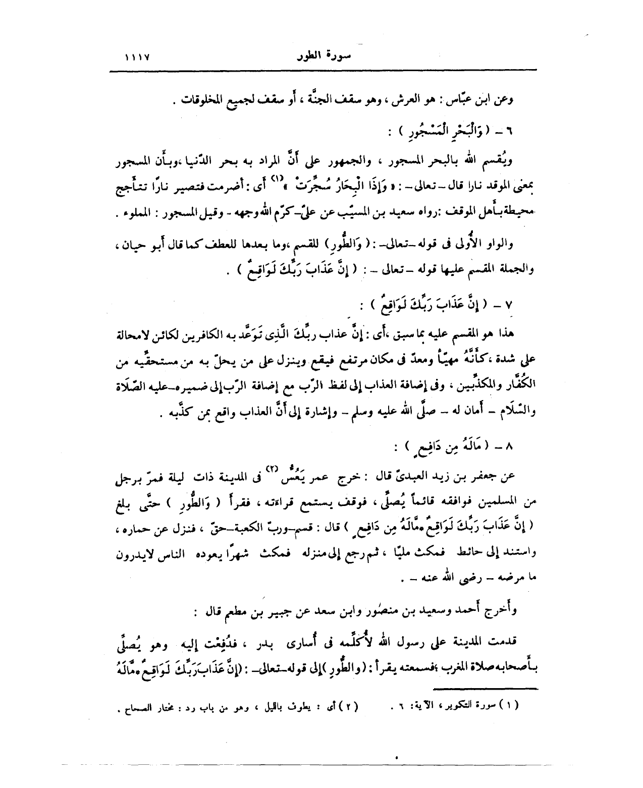 ويُقسم الله بالبحر المسجور، والجمهور على أنَّ المراد به بحر الدنيا، وبأَن المسجور بمعنى الموقد نارا قال - تعالى -: {وَإِذَا الْبِحَارُ سُجِّرَتْ} (¬1) أي: أضرمت فتصير نارا تتأجج محيطة بأهل الموقف: رواه سعيد بن المسيب عن علي - كرم الله وجهه - وقيل المسجور: المملوء.