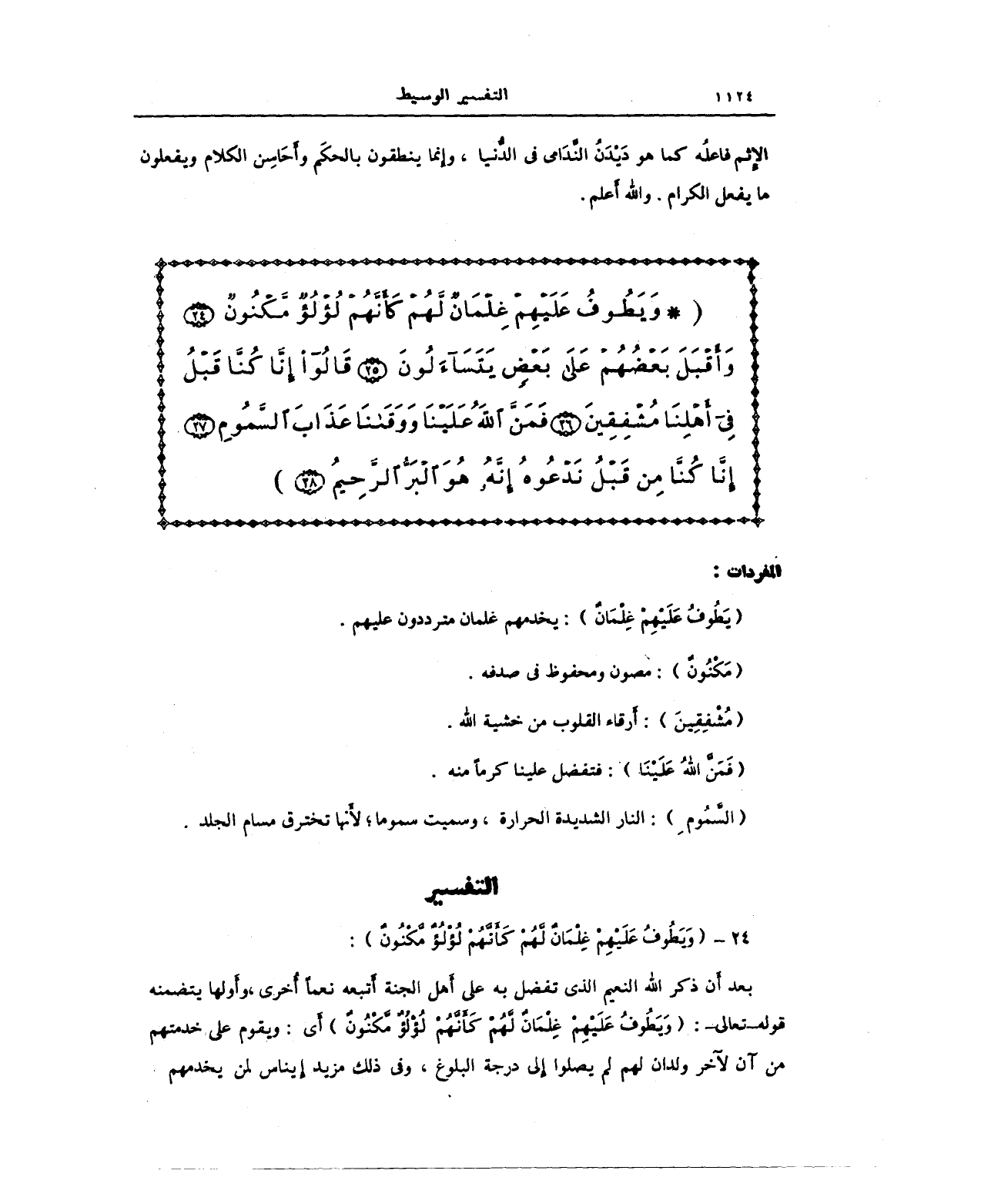 {وَيَطُوفُ عَلَيْهِمْ غِلْمَانٌ لَهُمْ كَأَنَّهُمْ لُؤْلُؤٌ مَكْنُونٌ (24) وَأَقْبَلَ بَعْضُهُمْ عَلَى بَعْضٍ يَتَسَاءَلُونَ (25) قَالُوا إِنَّا كُنَّا قَبْلُ فِي أَهْلِنَا مُشْفِقِينَ (26) فَمَنَّ اللَّهُ عَلَيْنَا وَوَقَانَا عَذَابَ السَّمُومِ (27) إِنَّا كُنَّا مِنْ قَبْلُ نَدْعُوهُ إِنَّهُ هُوَ الْبَرُّ الرَّحِيمُ (28)}