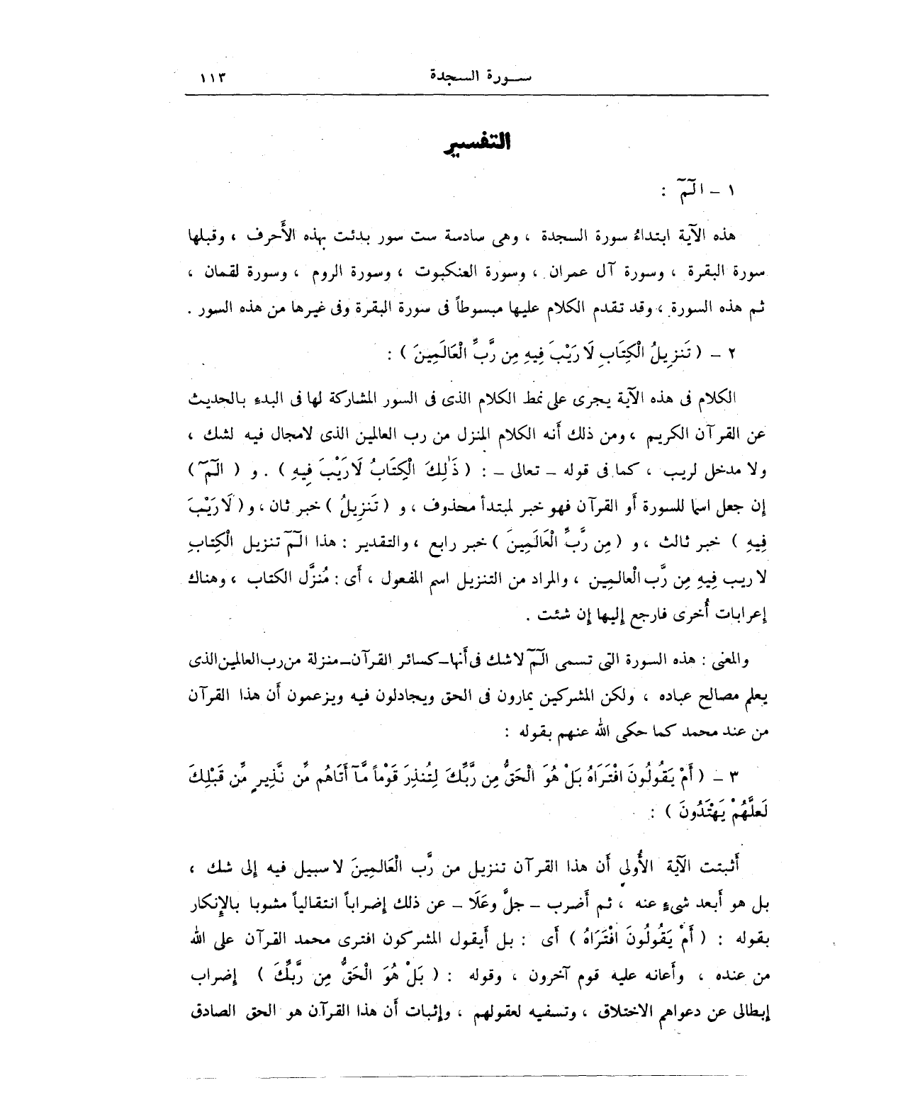الكلام في هذه الآية يجري على نمط الكلام الذي في السور المشاركة لها في البدء بالحديث عن القرآن الكريم، ومن ذلك أنه الكلام المنزل من رب العالمين الذي لا مجال فيه لشك، ولا مدخل لريب، كما في قوله - تعالى -: {ذَلِكَ الْكِتَابُ لَا رَيْبَ فِيهِ}. و {الم} إن جعل اسما للسورة أو القرآن فهو خبر لمبتدأ محذوف، و {تَنْزِيلُ} خبر ثان، و {لَا رَيْبَ فِيهِ} خبر ثالث، و {مِنْ رَبِّ الْعَالَمِينَ} خبر رابع، والتقدير: هذا الم تَنْزِيلُ الْكِتَابِ لَا رَيْبَ فِيهِ مِنْ رَبِّ الْعَالَمِين، والمراد من التنزيل اسم المفعول، أي: مُنزَّل الكتاب، وهناك إعرابات أخرى فارجع إليها إن شئت.