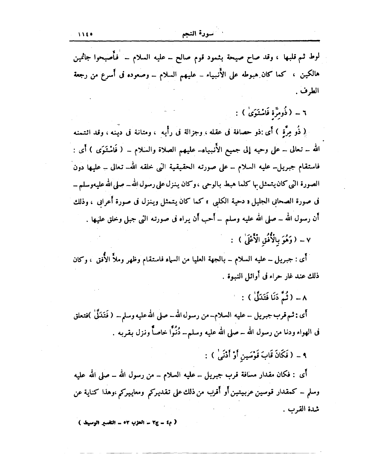 {ذُو مِرَّةٍ} أي: ذو حصافة في عقله، وجزالة في رأيه، ومتانة في دينه، وقد ائتمنه الله - تعالى - على وحيه إلى جميع الأنبياء - عليهم الصلاة والسلام - {فَاسْتَوَى} أي: فاستقام جبريل - عليه السلام - على صورته الحقيقية التي خلقه الله - تعالى - عليها دون الصورة التي كان يتمثل بها كلما هبط بالوحي، وكان ينزل على رسول الله - صلى الله عليه وسلم - في صورة الصحابي الجليل "دحية الكلبي" كما كان يتمثل وينزل في صورة أعرابي، وذلك أن رسول الله - صلى الله عليه وسلم - أحب أن يراه في صورته التي جبل وخلق عليها.