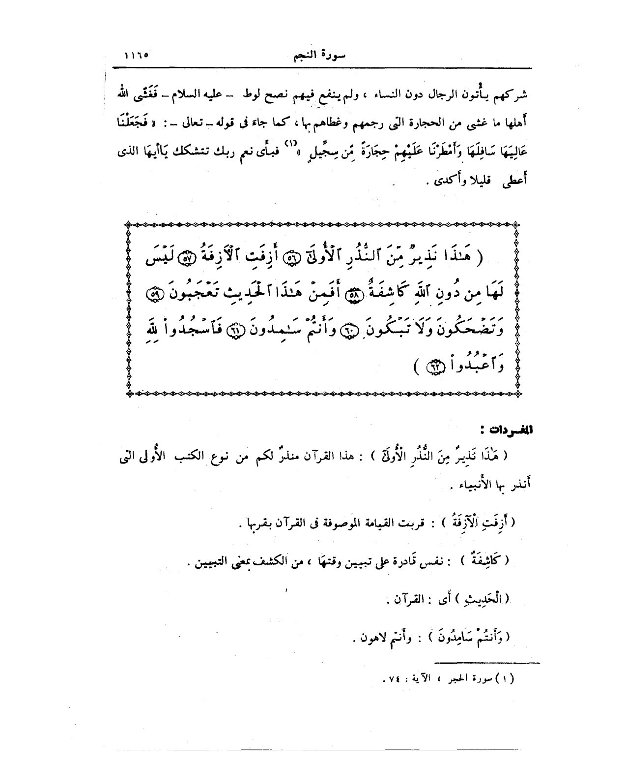 {هَذَا نَذِيرٌ مِنَ النُّذُرِ الْأُولَى (56) أَزِفَتِ الْآزِفَةُ (57) لَيْسَ لَهَا مِنْ دُونِ اللهِ كَاشِفَةٌ (58) أَفَمِنْ هَذَا الْحَدِيثِ تَعْجَبُونَ (59) وَتَضْحَكُونَ وَلَا تَبْكُونَ (60) وَأَنْتُمْ سَامِدُونَ (61) فَاسْجُدُوا لِلَّهِ وَاعْبُدُوا (62)}