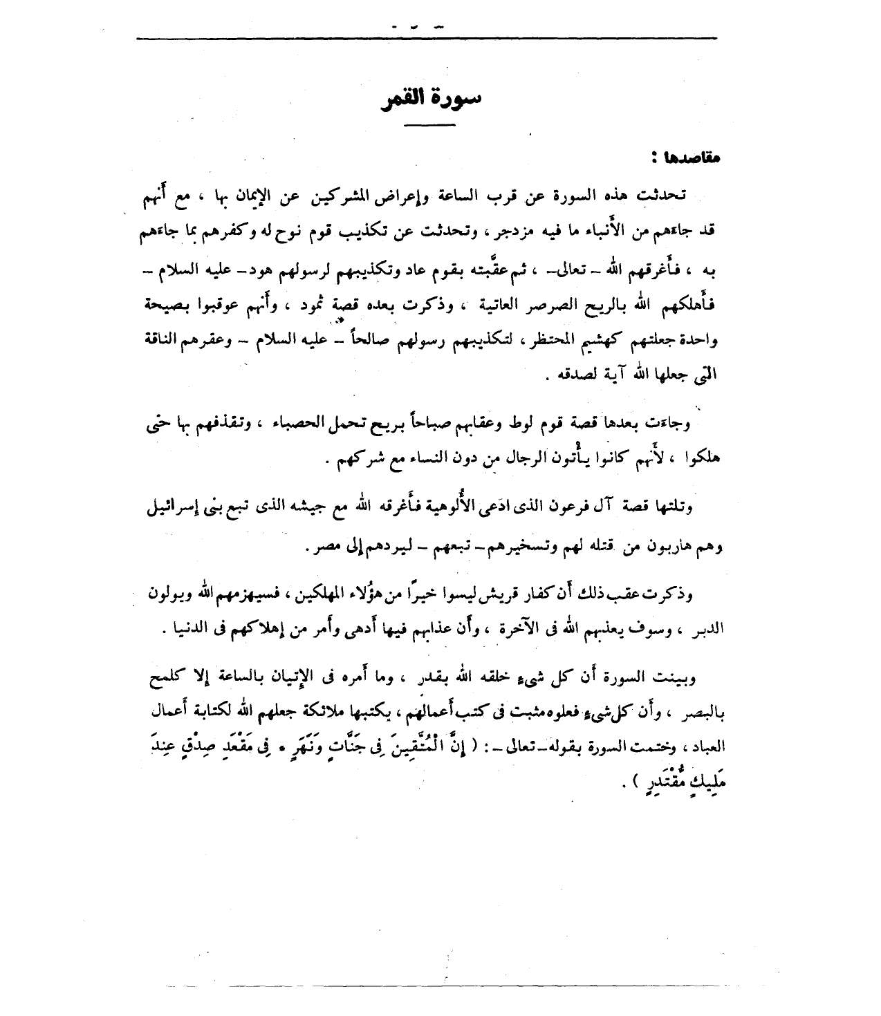 تحدثت هذه السورة عن قرب الساعة وإعراض المشركين عن الإيمان بها، مع أنهم قد جاءهم من الأنباء ما فيه مزدجر، وتحدثت عن تكذيب قوم نوح له وكفرهم بما جاءهم به، فأغرقهم الله - تعالى -، ثم عقَّبته بقوم عاد وتكذيبهم لرسولهم هود - عليه السلام - فأهلكهم الله بالريح الصرصر العاتية، وذكرت بعده قصة ثمود، وأنهم عوقبوا بصيحة واحدة جعلتهم كهشيم المحتظر، لتكذيبهم رسولهم صالحًا - عليه السلام - وعقرهم الناقة التي جعلها الله آية لصدقه.