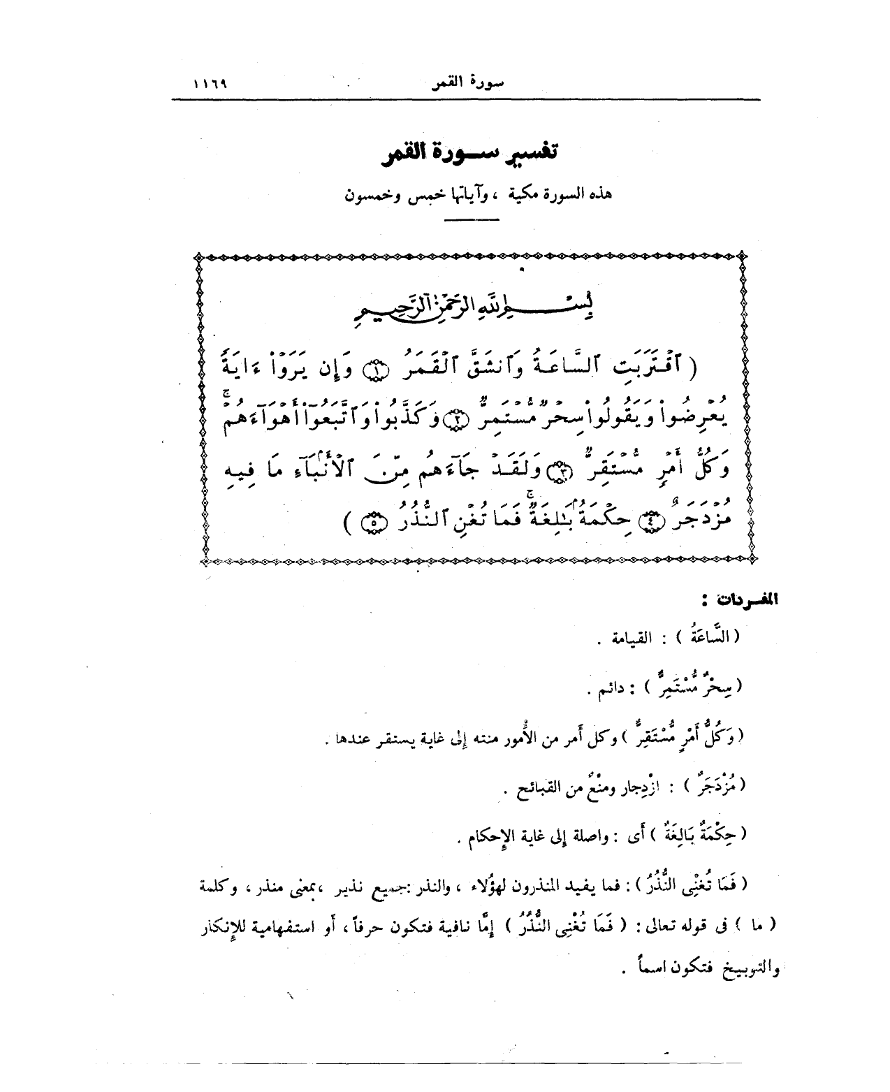 {اقْتَرَبَتِ السَّاعَةُ وَانْشَقَّ الْقَمَرُ (1) وَإِنْ يَرَوْا آيَةً يُعْرِضُوا وَيَقُولُوا سِحْرٌ مُسْتَمِرٌّ (2) وَكَذَّبُوا وَاتَّبَعُوا أَهْوَاءَهُمْ وَكُلُّ أَمْرٍ مُسْتَقِرٌّ (3) وَلَقَدْ جَاءَهُمْ مِنَ الْأَنْبَاءِ مَا فِيهِ مُزْدَجَرٌ (4) حِكْمَةٌ بَالِغَةٌ فَمَا تُغْنِ النُّذُرُ (5)}