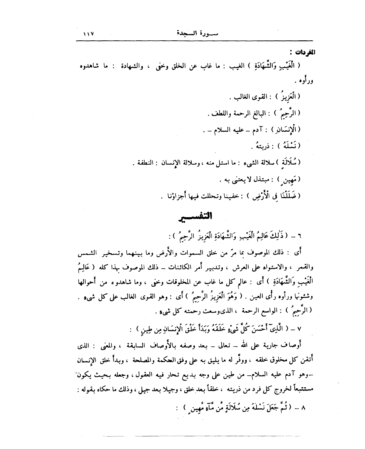 أوصاف جارية على الله - تعالى - بعد وصفه بالأوصاف السابقة، والمعنى: الذي أتقن كل مخلوق خلقه، ووفَّر له ما يليق به على وفق الحكمة والمصلحة، وبدأ خلق الإنسان - وهو آدم عليه السلام - من طين على وجه بديع تحار فيه العقول، وجعله بحيث يكون مستتبعًا لخروج كل فرد من ذريته، خلقًا بعد خلق، وجيلا بعد جيل، وذلك ما حكاه بقوله: