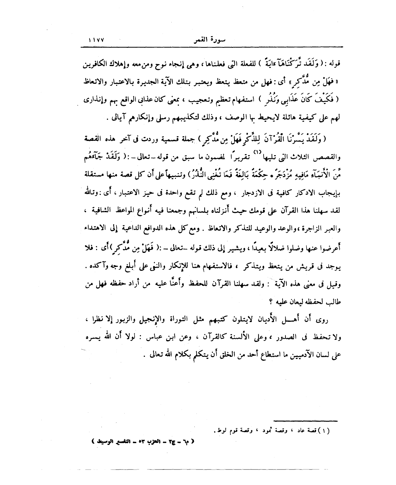 {وَلَقَدْ يَسَّرْنَا الْقُرْآنَ لِلذِّكْرِ فَهَلْ مِنْ مُدَّكِرٍ} جملة قسمية وردت في آخر هذه القصة والقصص الثلاث التي تليها (¬1) تقريرًا لمضمون ما سبق من قوله - تعالى -: {وَلَقَدْ جَاءَهُمْ مِنَ الْأَنْبَاءِ مَا فِيهِ مُزْدَجَرٌ (4) حِكْمَةٌ بَالِغَةٌ فَمَا تُغْنِ النُّذُرُ} وتنبيهًا على أن كل قصة منها مستقلة بإيجاب الادكار كافية في الازدجار، ومع ذلك لم تقع واحدة في حيز الاعتبار، أي: وتالله لقد سهلنا هذا القرآن على قومك حيث أنزلناه بلسانهم وجمعنا فيه أنواع المواعظ الشافية، والعبر الزاجرة، والوعد والوعيد للتذكر والاتعاظ. ومع كل هذه الدوافع الداعية إلى الاهتداء أعرضوا عنها وضلوا ضلًالا بعدًا، ويشير إلى في لك قوله - تعالى -: {فَهَلْ مِنْ مُدَّكِرٍ} أي: فلا يوجد في قريش من يتعظ ويتذكر، فالاستفهام هنا للإنكار والنفى على أبلغ وجه وآكده. وقيل في معنى هذه الآية: ولقد سهلنا القرآن للحفظ وأعنَّا عليه من أراد حفظه فهل من طالب لحفظه ليعان عليه؟