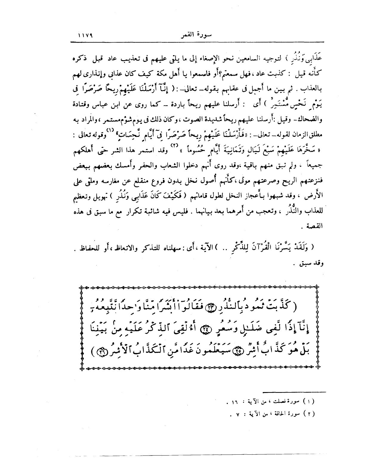 عَذَابِي وَنُذُرِ} لتوجيه السامعين نحو الإصغاء إلى ما يلقى عليهم في تعذيب عاد قبل ذكره كأنه قيل: كذبت عاد، فهل سمعتم؟ أو فاسمعوا يا أَهل مكة كيف كان عذابى وإنذارى لهم بالعذاب. ثم بين ما أجمل في عقابهم بقوله - تعالى -: {إِنَّا أَرْسَلْنَا عَلَيْهِمْ رِيحًا صَرْصَرًا فِي يَوْمِ نَحْسٍ مُسْتَمِرٍّ} أَي: أَرسلنا عليهم ريحًا باردة - كما روى عن ابن عباس وقتادة والضحاك - وقيل: أرسلنا عليهم ريحًا شديدة الصوت، وكان ذلك في يوم شؤم مستمر، والمراد به مطلق الزمان لقوله - تعالى -: {فَأَرْسَلْنَا عَلَيْهِمْ رِيحًا صَرْصَرًا فِي أَيَّامٍ نَحِسَاتٍ} (¬1) وقوله تعالى: {سَخَّرَهَا عَلَيْهِمْ سَبْعَ لَيَالٍ وَثَمَانِيَةَ أَيَّامٍ حُسُومًا} (¬2) وقد استمر هذا الشر حتى أَهلكهم جميعًا، ولم تبق منهم باقية، وقد روى أَنهم دخلوا الشعاب والحفر وأَمسك بعضهم ببعض فنزعتهم الريح وصرعتهم موتى، كأَنهم أصول نخل بدون فروع منقلع عن مغارسه وملقى على الأرض، وقد شبهوا بأَعجاز النخل لطول قاماتهم {فَكَيْفَ كَانَ عَذَابِي وَنُذُرِ} تهويل وتعظيم للعذاب والنُّذُر، وتعجب من أمرهما بعد بيانهما. فليس فيه شائبة تكرار مع ما سبق في هذه القصة.