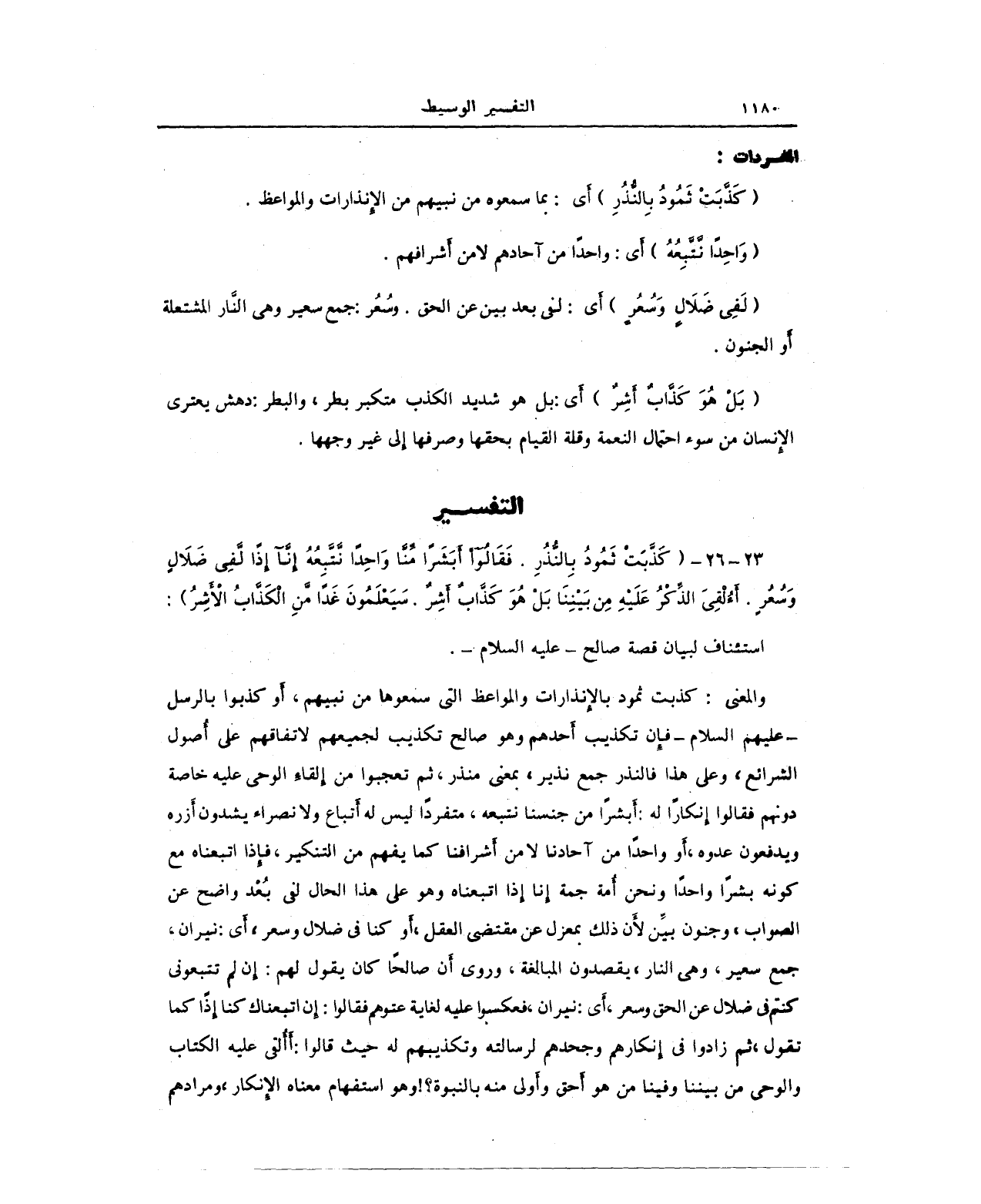 والمعنى: كذبت ثمود بالإنذارات والمواعظ التي سمعوها من نبيهم، أو كذبوا بالرسل - عليهم السلام - فإِن تكذيب أَحدهم وهوصالح تكذيب لجميعهم لاتفاقهم على أُصول الشرائع، وعلى هذا فالنذر جمع نذير، بمعنى منذر، ثم تعجبوا من إلقاءِ الوحى عليه خاصة دونهم فقالوا إنكارًا له: أبشرًا من جنسنا نتبعه، متفردًا ليس له أَتباع ولا نصراء يشدون أَزره ويدفعون عدوه، أو واحدًا من آحادنا لا من أَشرافنا كما يفهم من التنكير، فإذا اتبعناه مع كونه بشرًا واحدًا ونحن أُمة جمة إنا إذا اتبعناه وهو على هذا الحال لفى بُعْد واضح عن الصواب، وجنون بيَّن لأن ذلك بمعزل عن مقتضى العقل، أو كنا في ضلال وسعر، أي: نيران، جمع سعير، وهي النار، يقصدون المبالغة، وروى أن صالحًا كان يقول لهم: إن لم تتبعونى كنتم في ضلال عن الحق وسعر، أَي: نيران، فعكسوا عليه لغاية عتوهم فقالوا: إن اتبعناك كنا إذًا كما تقول، ثم زادوا في إنكارهم وجحدهم لرسالته وتكذيبهم له حيث قالوا: أألقى عليه الكتاب والوحى من بيننا وفينا من هو أحق وأولى منه بالنبوة؟! وهو استفهام معناه الإنكار، ومرادهم