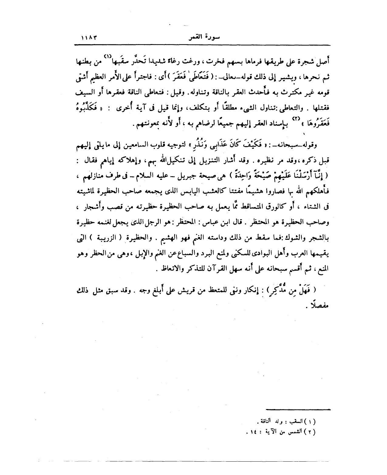 وقوله - سبحانه -: {فَكَيْفَ كَانَ عَذَابِي وَنُذُرِ} لتوجيه قلوب السامعين إلى ما يلقى إليهم قبل ذكره، وقد مر نظيره. وقد أشار التنزيل إلى تنكيل الله بهم، وإهلاكه إياهم فقال: {إِنَّا أَرْسَلْنَا عَلَيْهِمْ صَيْحَةً وَاحِدَةً} هي صيحة جبريل - عليه السلام - في طرف منازلهم، فأَهلكهم الله بها فصاروا هشيمًا مفتتا كالعشب اليابس الذي يجمعه صاحب الحظيرة لماشيته في الشتاء، أو كالورق المتساقط ممَّا يعمل به صاحب الحظيرة حظيرته من قصب وأَشجار، وصاحب الحظيرة هو المحتظر. قال ابن عباس: المحتظر: هو الرجل الذي يجعل لغنمه حظيرة بالشجر والشوك: فما سقط من ذلك وداسته الغنم فهو الهشيم. والحظيرة (الزريبة) التي يقيمها العرب وأَهل البوادى للسكنى ولمنع البرد والسباع عن الغنم والإبل، وهي من الحظر وهو المنع، ثم أقسم سبحانه على أنه سهل القرآن للتذكر والاتعاظ.