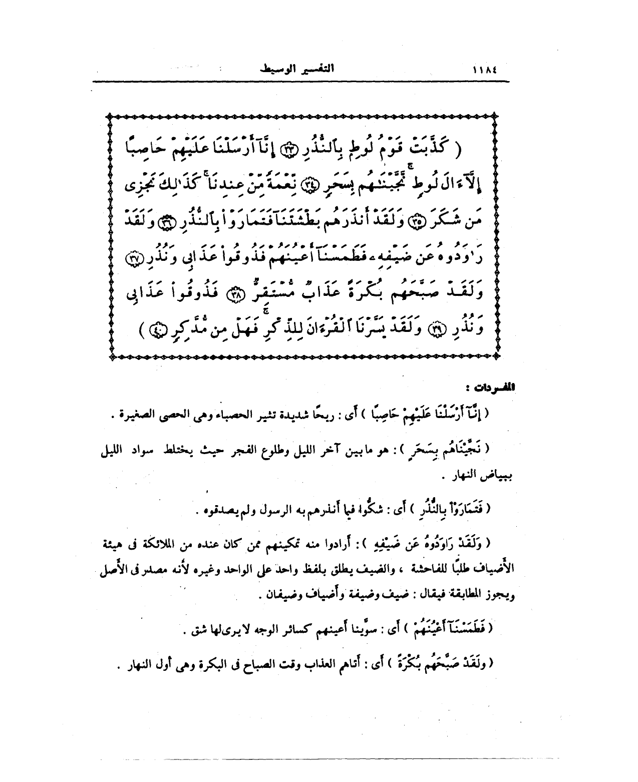 {كَذَّبَتْ قَوْمُ لُوطٍ بِالنُّذُرِ (33) إِنَّا أَرْسَلْنَا عَلَيْهِمْ حَاصِبًا إِلَّا آلَ لُوطٍ نَجَّيْنَاهُمْ بِسَحَرٍ (34) نِعْمَةً مِنْ عِنْدِنَا كَذَلِكَ نَجْزِي مَنْ شَكَرَ (35) وَلَقَدْ أَنْذَرَهُمْ بَطْشَتَنَا فَتَمَارَوْا بِالنُّذُرِ (36) وَلَقَدْ رَاوَدُوهُ عَنْ ضَيْفِهِ فَطَمَسْنَا أَعْيُنَهُمْ فَذُوقُوا عَذَابِي وَنُذُرِ (37) وَلَقَدْ صَبَّحَهُمْ بُكْرَةً عَذَابٌ مُسْتَقِرٌّ (38) فَذُوقُوا عَذَابِي وَنُذُرِ (39) وَلَقَدْ يَسَّرْنَا الْقُرْآنَ لِلذِّكْرِ فَهَلْ مِنْ مُدَّكِرٍ (40)}