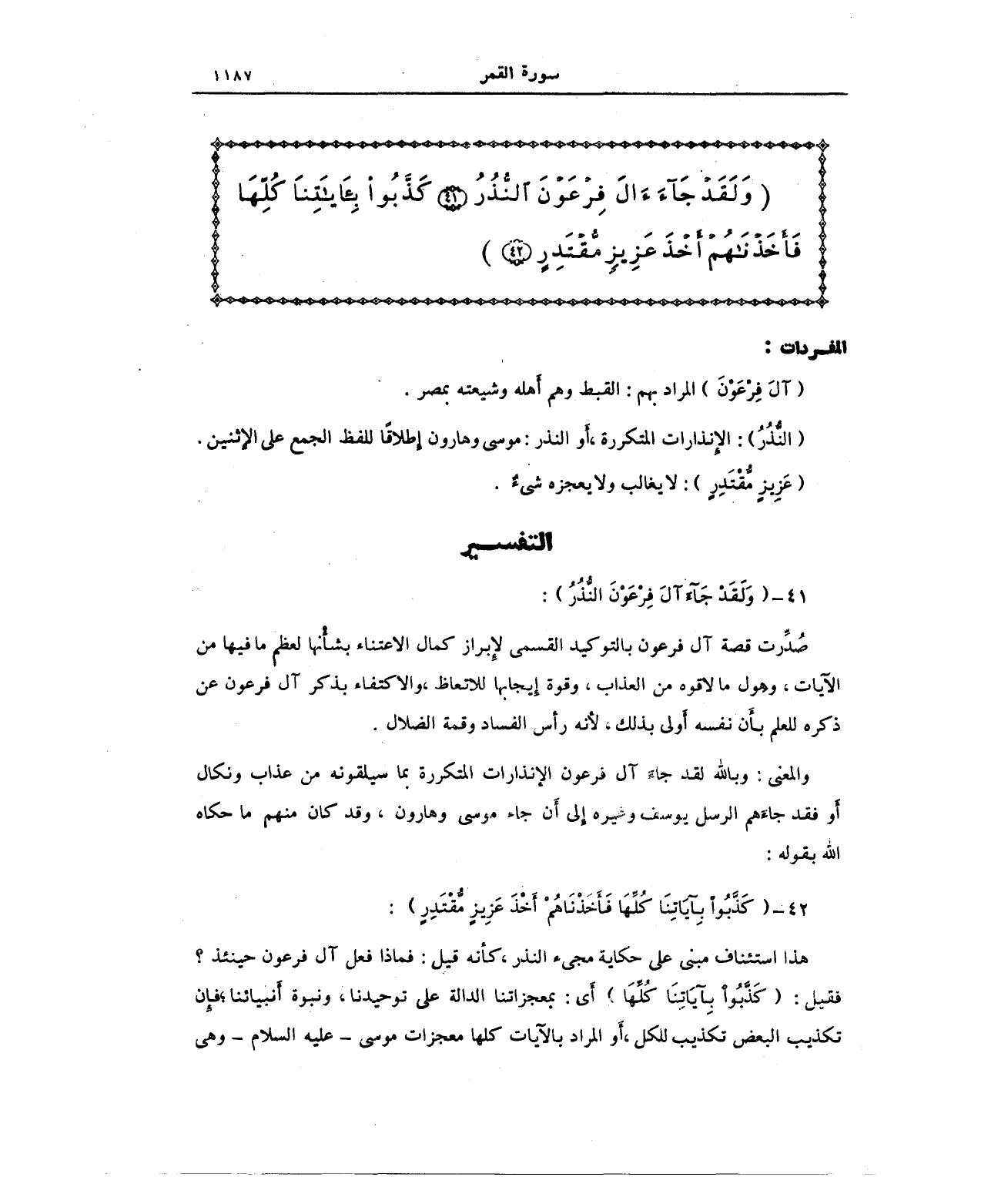 {وَلَقَدْ جَاءَ آلَ فِرْعَوْنَ النُّذُرُ (41) كَذَّبُوا بِآيَاتِنَا كُلِّهَا فَأَخَذْنَاهُمْ أَخْذَ عَزِيزٍ مُقْتَدِرٍ (42)}