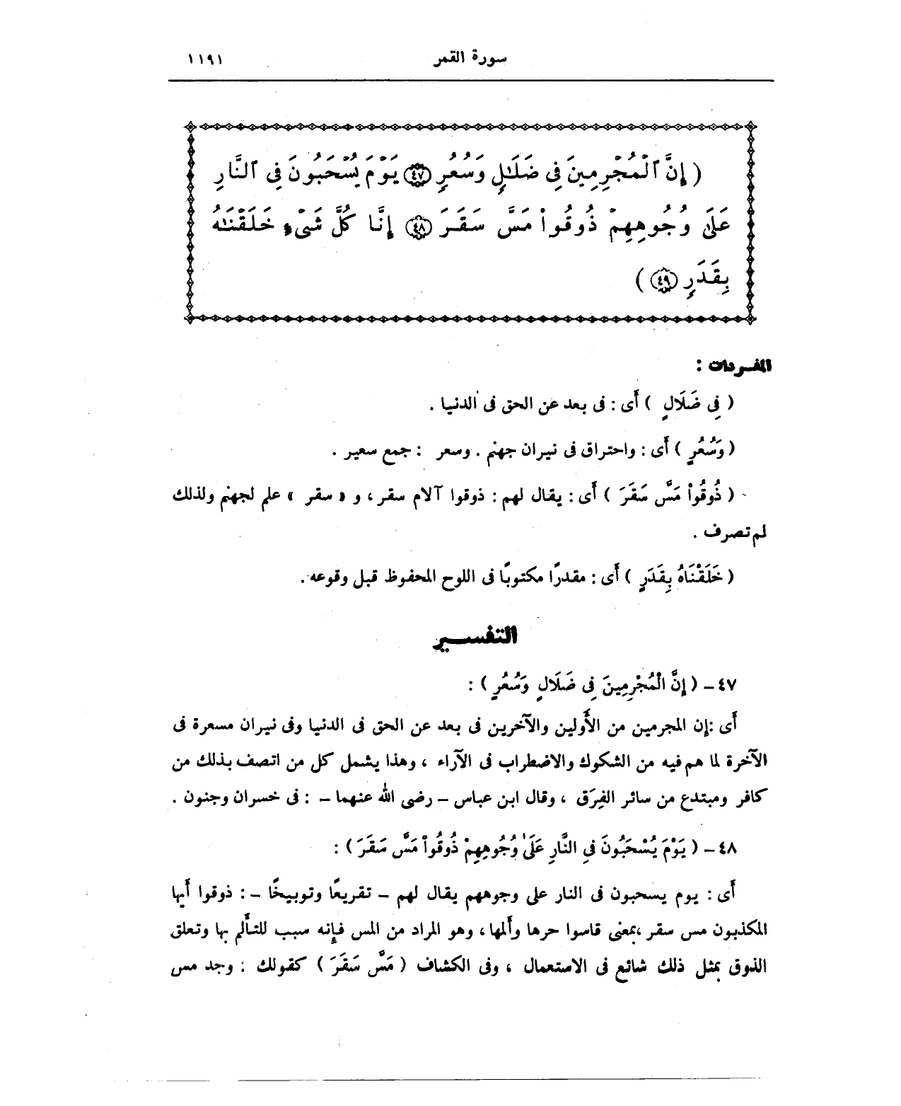 {إِنَّ الْمُجْرِمِينَ فِي ضَلَالٍ وَسُعُرٍ (47) يَوْمَ يُسْحَبُونَ فِي النَّارِ عَلَى وُجُوهِهِمْ ذُوقُوا مَسَّ سَقَرَ (48) إِنَّا كُلَّ شَيْءٍ خَلَقْنَاهُ بِقَدَرٍ (49)}