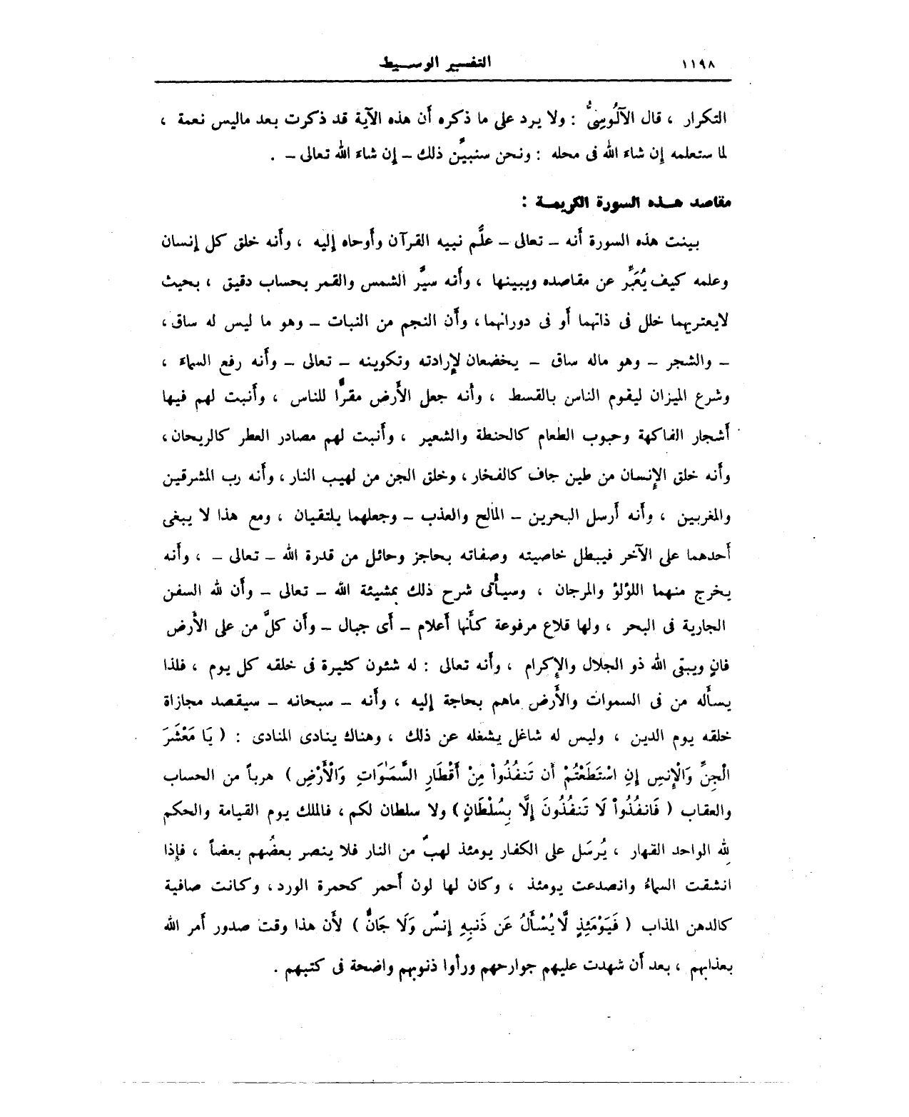 بينت هذه السورة أنه - تعالى - علَّم نبيه القرآن وأوحاه إليه، وأنه خلق كل إنسان وعلمه كيف يُعبِّر عن مقاصده ويبينها، وأنه سيَّر الشمس والقمر بحساب دقيق، بحيث لا يعتريهما خلل في ذاتهما أو في دورانهما، وأن النجم من النبات - وهو ما ليس له ساق، - والشجر - وهو ماله ساق - يخضعان لإرادته وتكوينه - تعالى - وأنه رفع السماء، وشرع الميزان ليقوم الناس بالقسط، وأنه جعل الأرض مقرًّا للناس، وأنبت لهم فيها أشجار الفاكهة وحبوب الطعام كالحنطة والشعير، وأنبت لهم مصادر العطر كالريحان، وأنه خلق الإنسان من طين جاف كالفخار، وخلق الجن من لهيب النار، وأنه رب المشرقين والمغربين، أنه أرسل البحرين - المالح والعذب - وجعلهما يلتقيان، ومع هذا لا يبغى أحدهما على الآخر فيبطل خاصيته وصفاته بحاجز وحائل من قدرة الله - تعالى -، وأنه يخرج منهما اللؤلؤ والمرجان، وسيأتي شرح ذلك بمشيئة الله - تعالى - وأن لله السفن الجارية في البحر، ولها قلاع مرفوعة كأنها أعلام - أي جبال - وأن كل من على الأرض فإن ويبقى الله ذو الجلال والإكرام، وأنه تعالى: له شئون كثيرة في خلقه كل يوم، فلذا يسأله من في السموات والأرض ما هم بحاجة إليه، وأنه - سبحانه - سيقصد مجازاة خلقه يوم الدين، وليس له شاغل يشغله عن ذلك، وهناك ينادى المنادي: {يَا مَعْشَرَ الْجِنِّ وَالْإِنْسِ إِنِ اسْتَطَعْتُمْ أَنْ تَنْفُذُوا مِنْ أَقْطَارِ السَّمَاوَاتِ وَالْأَرْضِ} هربًا من الحساب والعقاب {فَانْفُذُوا لَا تَنْفُذُونَ إِلَّا بِسُلْطَانٍ} ولا سلطان لكم، فالملك يوم القيامة والحكم لله الواحد القهار، يُرسَل على الكفار يومئذ لهبٌ من النار فلا ينصر بعضهم بعضًا، فإذا انشقت السماء وانصدعت يومئذ، وكان لها لون أحمر كحمرة الورد، وكانت صافية كالدهن المذاب {فَيَوْمَئِذٍ لَا يُسْأَلُ عَنْ ذَنْبِهِ إِنْسٌ وَلَا جَانٌّ} لأن هذا وقت صدور أمر الله بعذابهم، بعد أن شهدت عليهم جوارحهم ورأوا ذنوبهم واضحة في كتبهم.