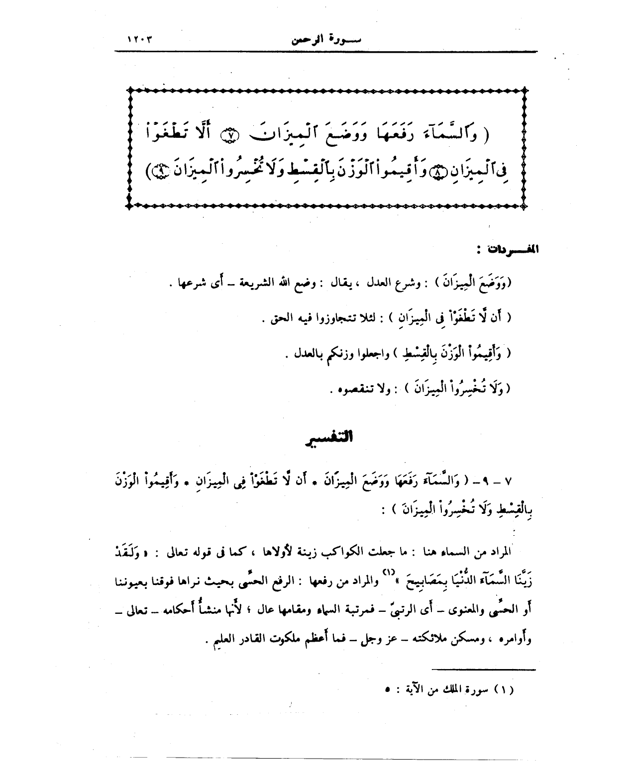 {وَالسَّمَاءَ رَفَعَهَا وَوَضَعَ الْمِيزَانَ (7) أَلَّا تَطْغَوْا فِي الْمِيزَانِ (8) وَأَقِيمُوا الْوَزْنَ بِالْقِسْطِ وَلَا تُخْسِرُوا الْمِيزَانَ (9)}