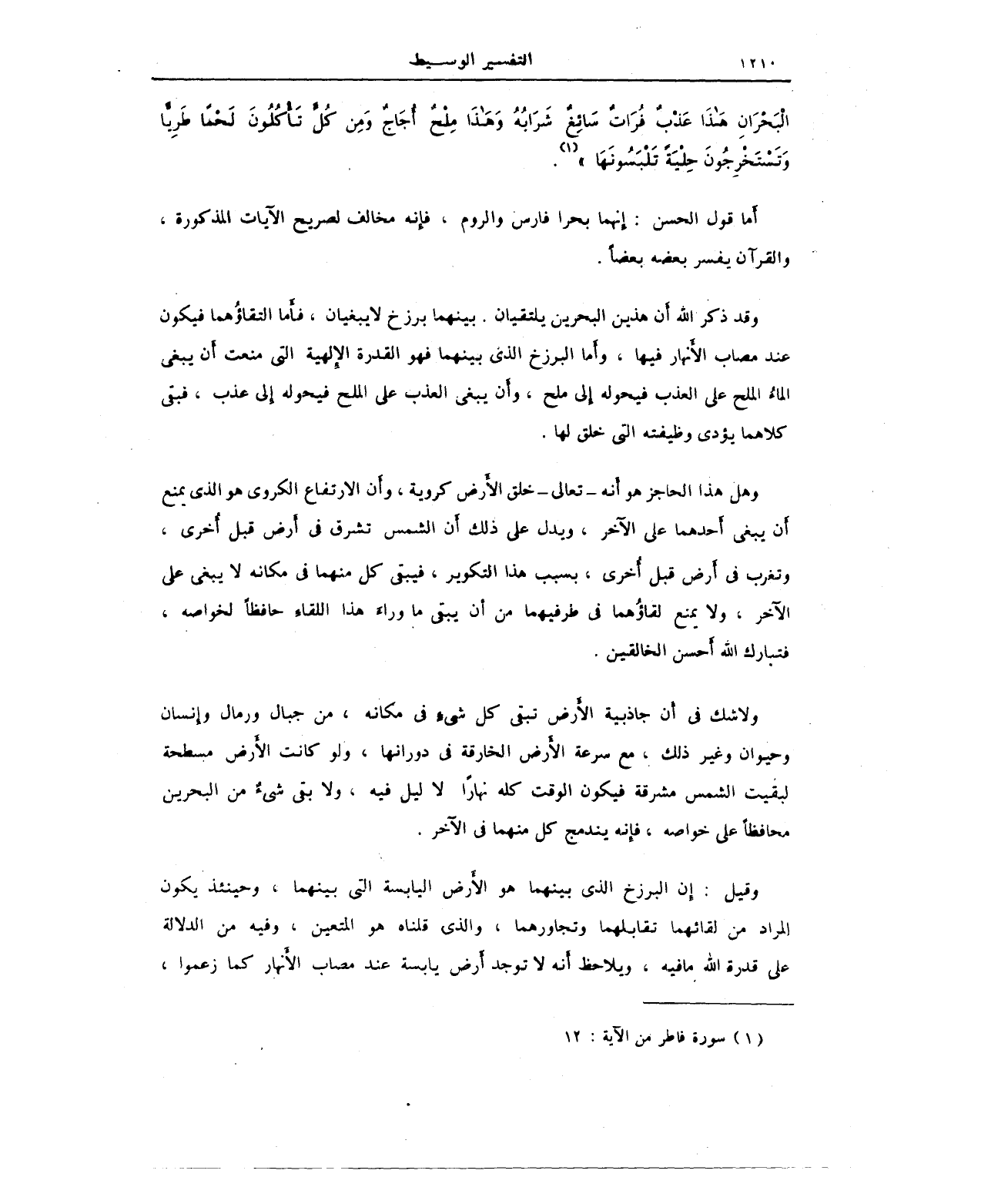 وهل هذا الحاجز هو أنه - تعالى - خلق الأرض كروية، وأن الارتفاع الكروى هو الذي يمنع أن يبغى أحدهما على الآخر، ويدل على ذلك أن الشمس تشرق في أرض قبل أخرى، وتغرب في أرض قبل أخرى، بسبب هذا التكوير، فيبقى كل منهما في مكانه لا يبغي على الآخر، ولا يمنع لقاؤهما في طرفيهما من أن يبقى ما وراء هذا اللقاء حافظًا لخواصه، فتبارك الله أحسن الخالقين.