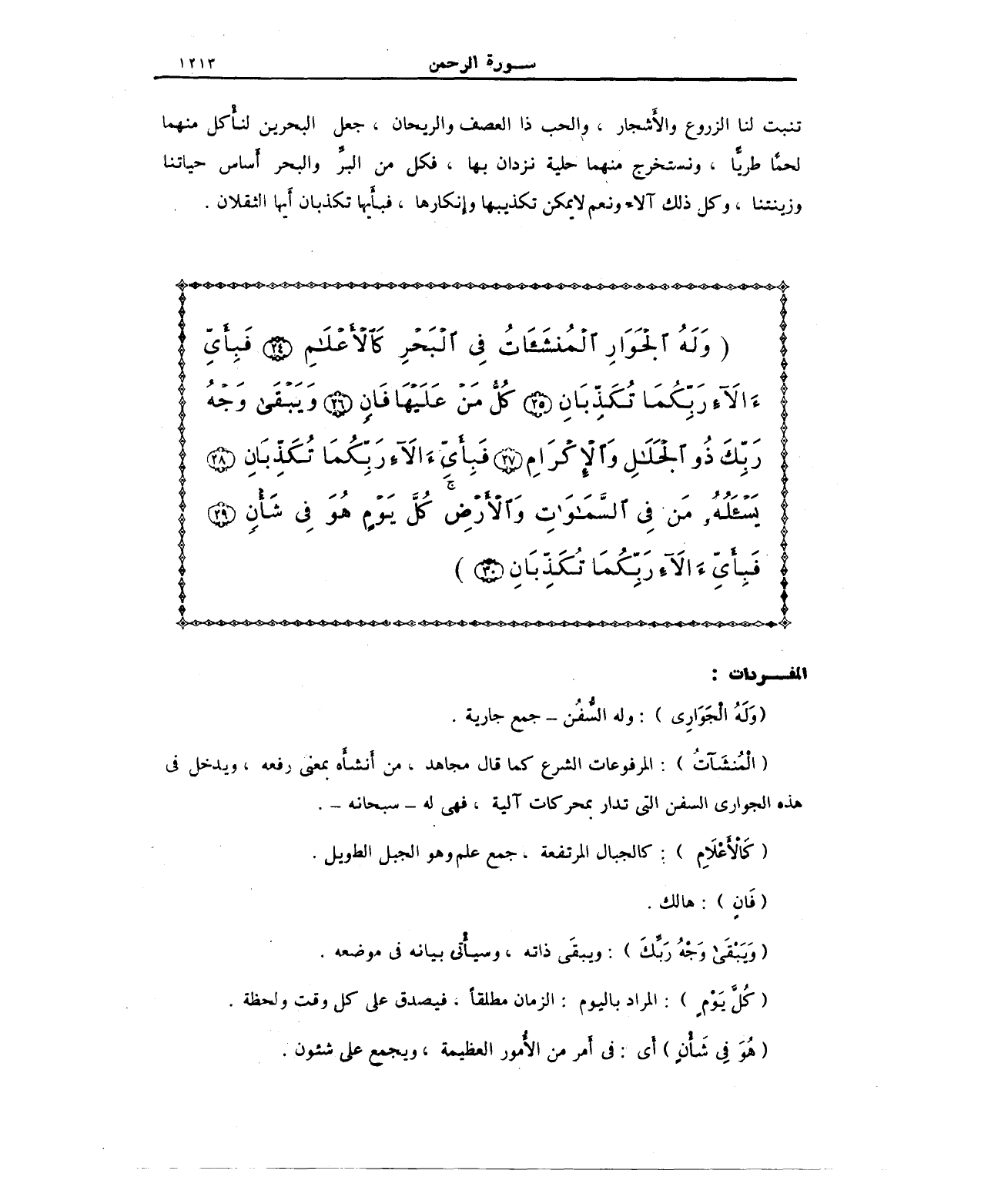 {وَلَهُ الْجَوَارِ الْمُنْشَآتُ فِي الْبَحْرِ كَالْأَعْلَامِ (24) فَبِأَيِّ آلَاءِ رَبِّكُمَا تُكَذِّبَانِ (25) كُلُّ مَنْ عَلَيْهَا فَانٍ (26) وَيَبْقَى وَجْهُ رَبِّكَ ذُوالْجَلَالِ وَالْإِكْرَامِ (27) فَبِأَيِّ آلَاءِ رَبِّكُمَا تُكَذِّبَانِ (28) يَسْأَلُهُ مَنْ فِي السَّمَاوَاتِ وَالْأَرْضِ كُلَّ يَوْمٍ هُوَ فِي شَأْنٍ (29) فَبِأَيِّ آلَاءِ رَبِّكُمَا تُكَذِّبَانِ (30)}