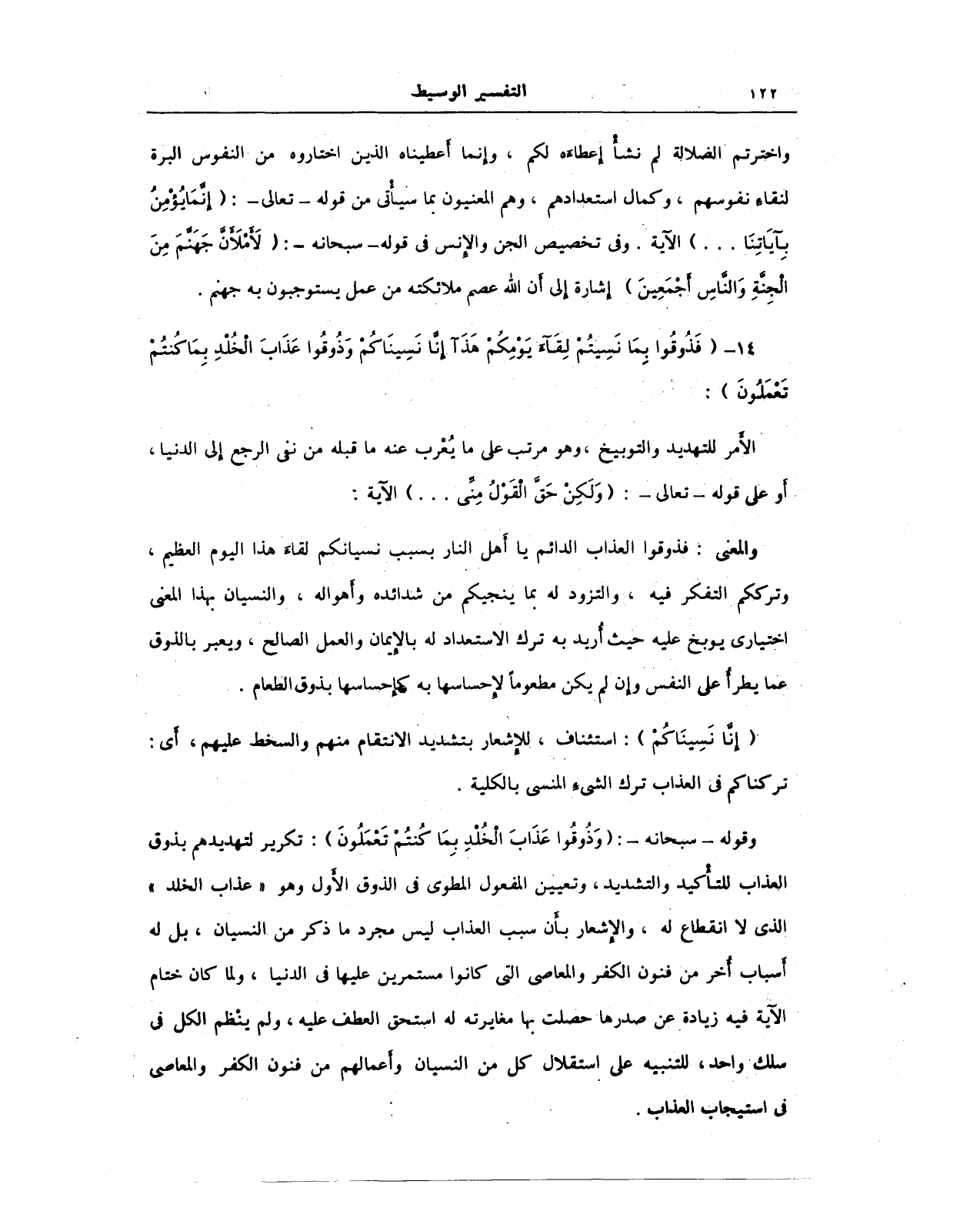 14 - {فَذُوقُوا بِمَا نَسِيتُمْ لِقَاءَ يَوْمِكُمْ هَذَا إِنَّا نَسِينَاكُمْ وَذُوقُوا عَذَابَ الْخُلْدِ بِمَا كُنْتُمْ تَعْمَلُونَ}: