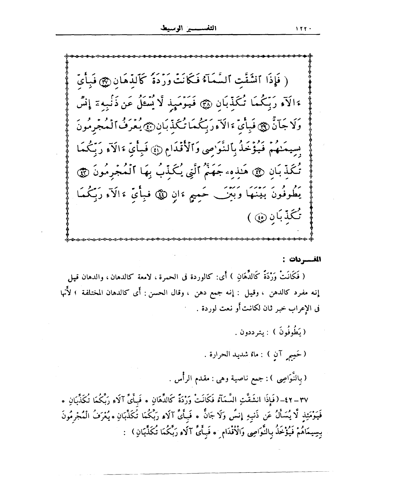 {فَإِذَا انْشَقَّتِ السَّمَاءُ فَكَانَتْ وَرْدَةً كَالدِّهَانِ (37) فَبِأَيِّ آلَاءِ رَبِّكُمَا تُكَذِّبَانِ (38) فَيَوْمَئِذٍ لَا يُسْأَلُ عَنْ ذَنْبِهِ إِنْسٌ وَلَا جَانٌّ (39) فَبِأَيِّ آلَاءِ رَبِّكُمَا تُكَذِّبَانِ (40) يُعْرَفُ الْمُجْرِمُونَ بِسِيمَاهُمْ فَيُؤْخَذُ بِالنَّوَاصِي وَالْأَقْدَامِ (41) فَبِأَيِّ آلَاءِ رَبِّكُمَا تُكَذِّبَانِ (42) هَذِهِ جَهَنَّمُ الَّتِي يُكَذِّبُ بِهَا الْمُجْرِمُونَ (43) يَطُوفُونَ بَيْنَهَا وَبَيْنَ حَمِيمٍ آنٍ (44) فَبِأَيِّ آلَاءِ رَبِّكُمَا تُكَذِّبَانِ (45)}