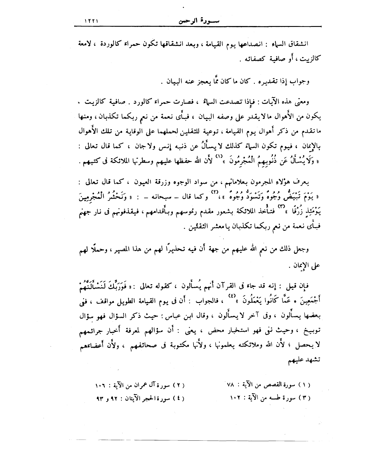 ومعنى هذه الآيات: فإذا تصدعت السماءُ، فصارت حمراء كالورد. صافية كالزيت، يكون من الأهوال ما لا يقدر على وصفه البيان، فبأى نعمة من نعم ربكما تكذبان، ومنها ما تقدم من ذكر أهوال يوم القيامة، توعية للثقلين لحملهما على الوقاية من تلك الأهوال بالإيمان، فيوم تكون السماءُ كذلك لا يسأل عن ذنبه إنس ولا جان، كما قال تعالى: {وَلَا يُسْأَلُ عَنْ ذُنُوبِهِمُ الْمُجْرِمُونَ} (¬1) لأن الله حفظها عليهم وسطرتها الملائكة في كتبهم.