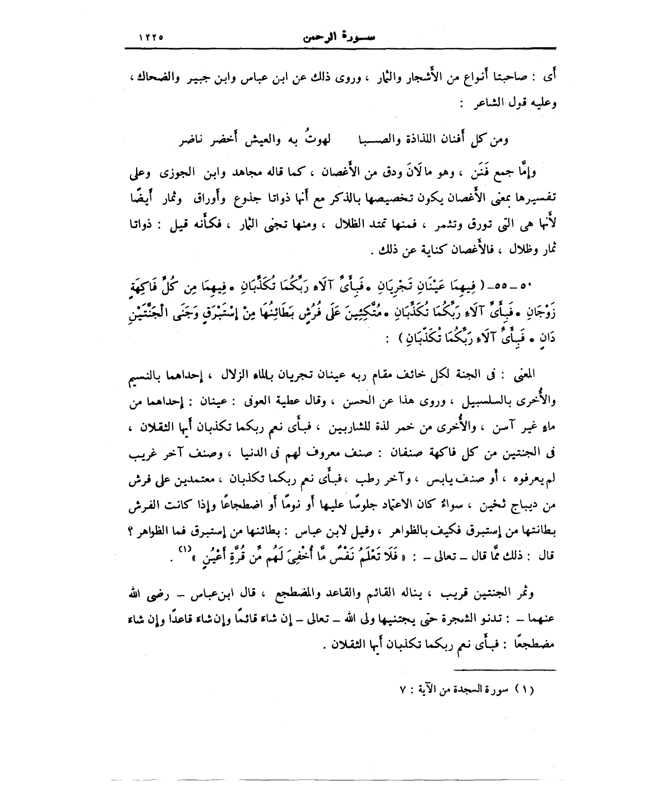 وإمَّا جمع فَنَن، وهو ما لَان ودق من الأغصان، كما قاله مجاهد وابن الجوزى وعلى تفسيرها بمعنى الأغصان يكون تخصيصها بالذكر مع أنها ذواتا جذوع وأوراق وثمار أيضًا لأنها هي التي تورق وتثمر، فمنها تمتد الظلال، ومنها تجنى الثمار، فكأنه قيل: ذواتا ثمار وظلال، فالأَغصان كناية عن ذلك.