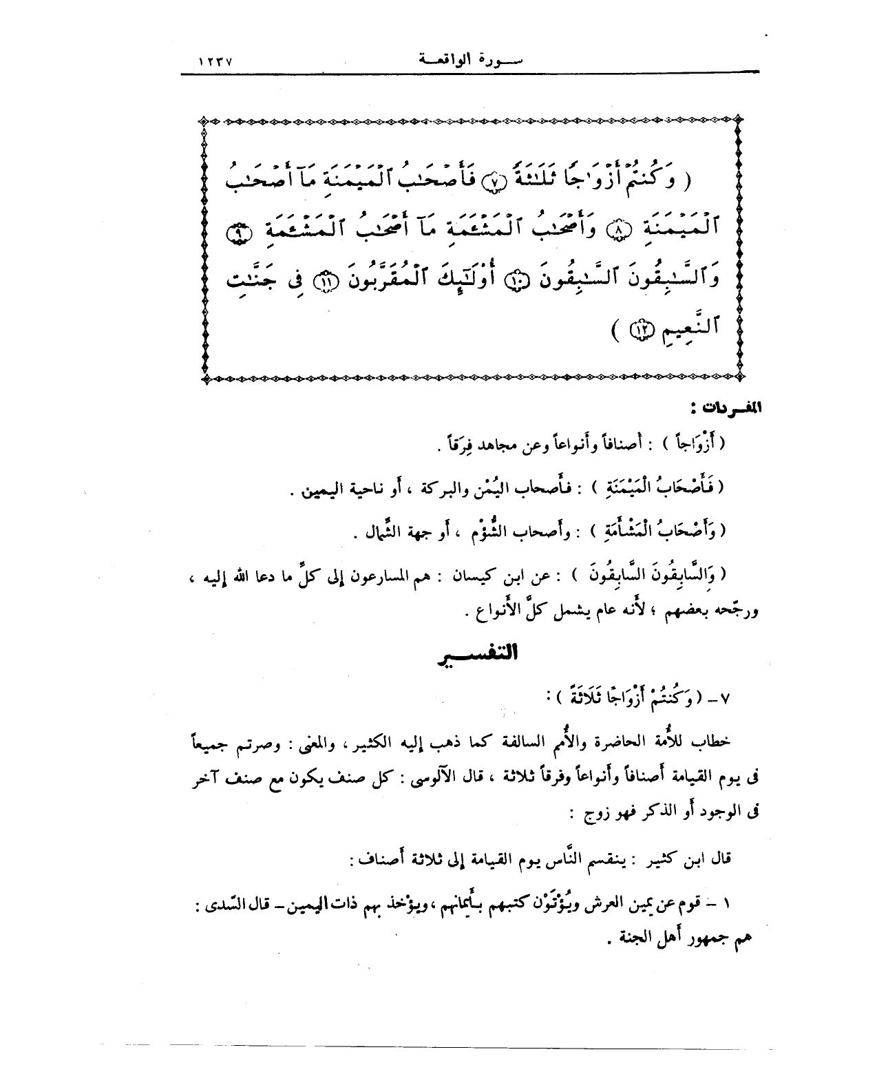 {وَكُنْتُمْ أَزْوَاجًا ثَلَاثَةً (7) فَأَصْحَابُ الْمَيْمَنَةِ مَا أَصْحَابُ الْمَيْمَنَةِ (8) وَأَصْحَابُ الْمَشْأَمَةِ مَا أَصْحَابُ الْمَشْأَمَةِ (9) وَالسَّابِقُونَ السَّابِقُونَ (10) أُولَئِكَ الْمُقَرَّبُونَ (11) في جَنَّاتِ النَّعِيمِ (12)}