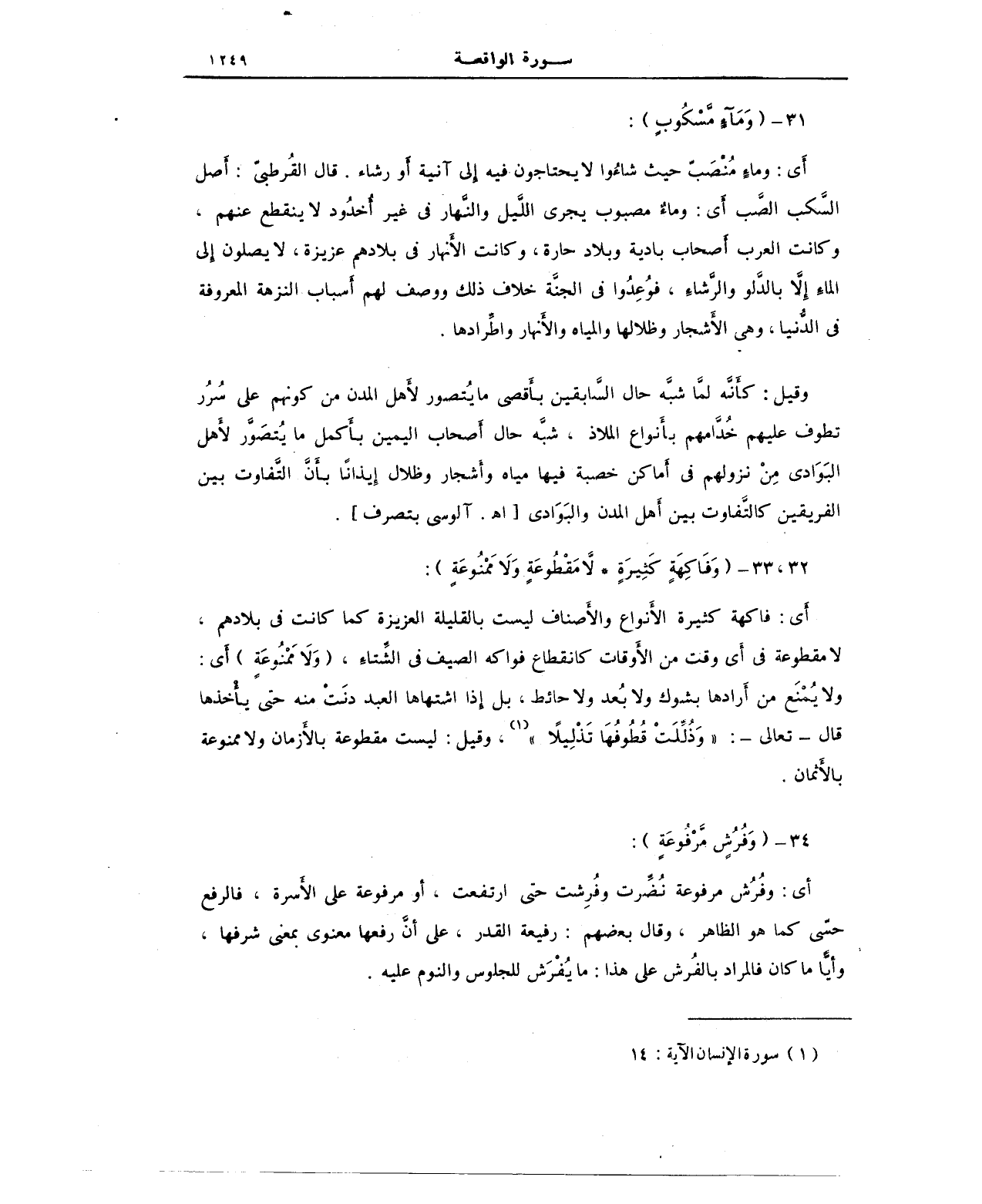 أي: وماء منصب حيث شاءوا لا يحتاجون فيه إلى آنية أو رشاء. قال القرطبي: أصل السكب الصب أي: وماءٌ مصبوب يجرى الليل والنّهار في غير أخدود لا ينقطع عنهم، وكانت العرب أصحاب بادية وبلاد حارة، وكانت الأنهار في بلادهم عزيزة، لا يصلون إلى الماء إلاَّ بالدلو والرَّشاء، فوعدوا في الجنة خلاف ذلك ووصف لهم أسباب النزهة المعروفة في الدانيا، وهي الأشجار وظلالها والمياه والأنهار واطِّرادها.