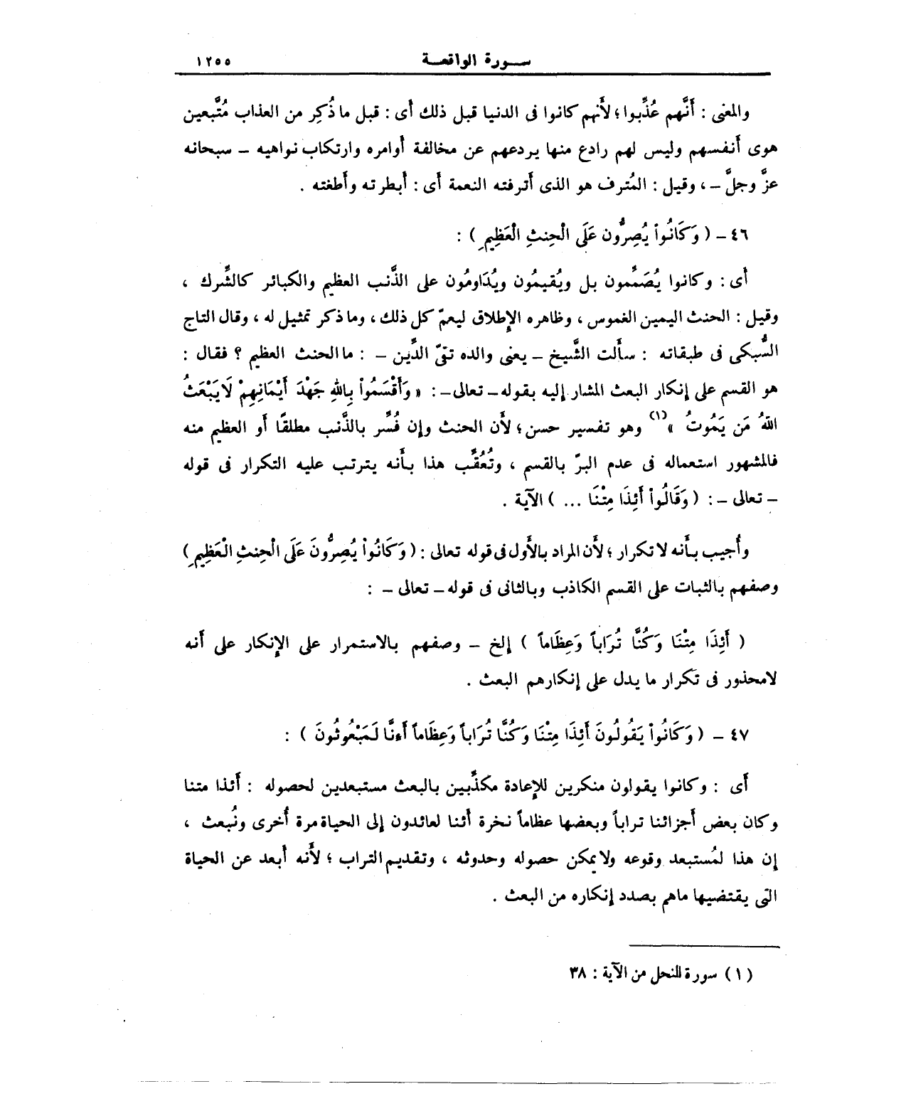 أي: وكانوا يصمِّمون بل ويقيمون ويداومون على الذنب العظيم والكبائر كالشرك، وقيل: الحنث اليمين الغموس، وظاهره الإطلاق ليعم كل ذلك، وما ذكر تمثيل له، وقال التاج السبكى في طبقاته: سألت الشيخ - يعنى والده تقي الدّين -: ما الحنث العظيم؟ فقال: هو القسم على إنكار البعث المشار إليه بقوله - تعالى -: {وَأَقْسَمُوا بِاللَّهِ جَهْدَ أَيْمَانِهِمْ لَا يَبْعَثُ اللَّهُ مَنْ يَمُوتُ} (¬1) وهو تفسير حسن؛ لأن الحنث وإن فُسِّر بالذنب مطلقًا أو العظيم منه فالمشهور استعماله في عدم البر بالقسم، وتُعُقِّب هذا بأنه يترتب عليه التكرار في قوله - تعالى -: {وَقَالُوا أَإِذَا متْنًا ... } الآية.