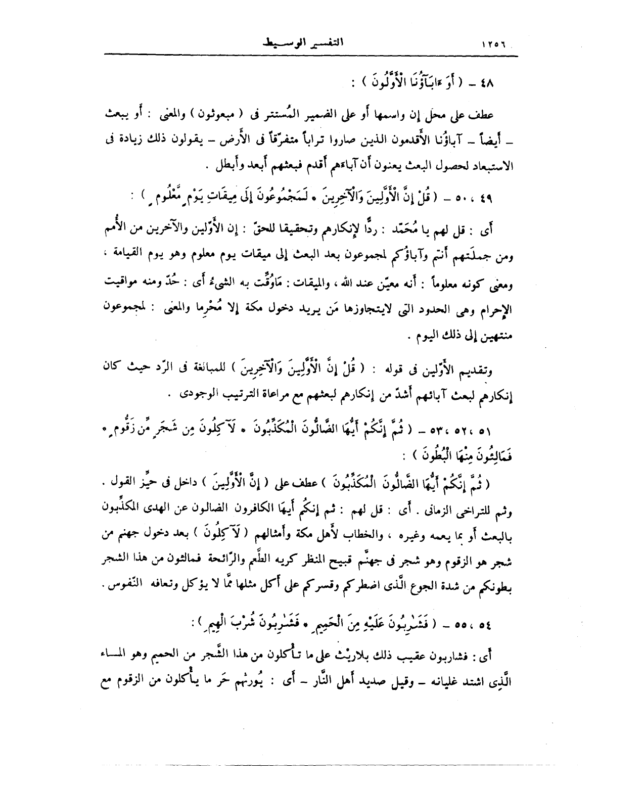 وتقديم الأولين في قوله: {قُلْ إِنَّ الْأَوَّلِينَ وَالْآخِرِينَ} للمبالغة في الرد حيث كان إنكارهم لبعث آبائهم أشدّ من إنكارهم لبعثهم مع مراعاة الترتيب الوجودى.
